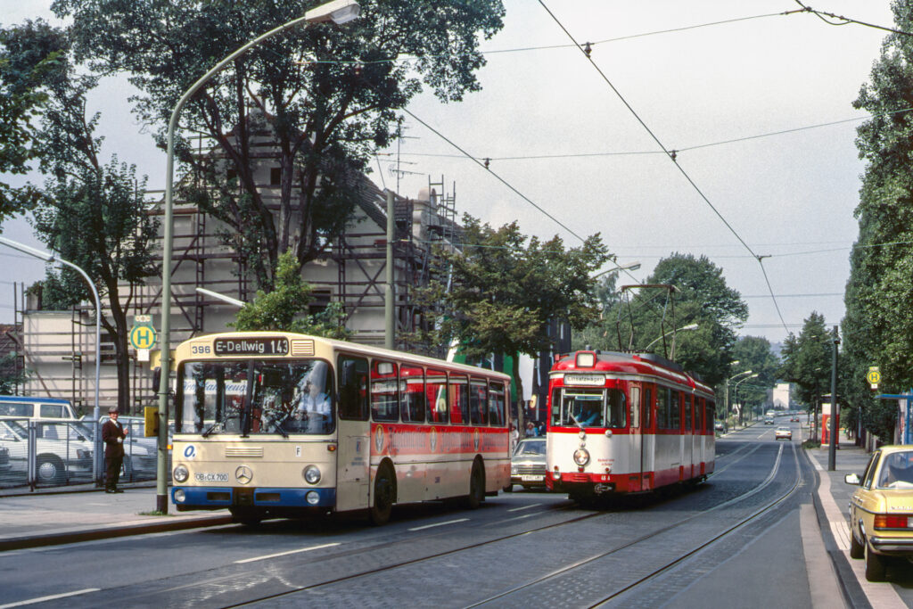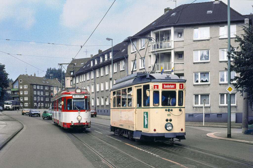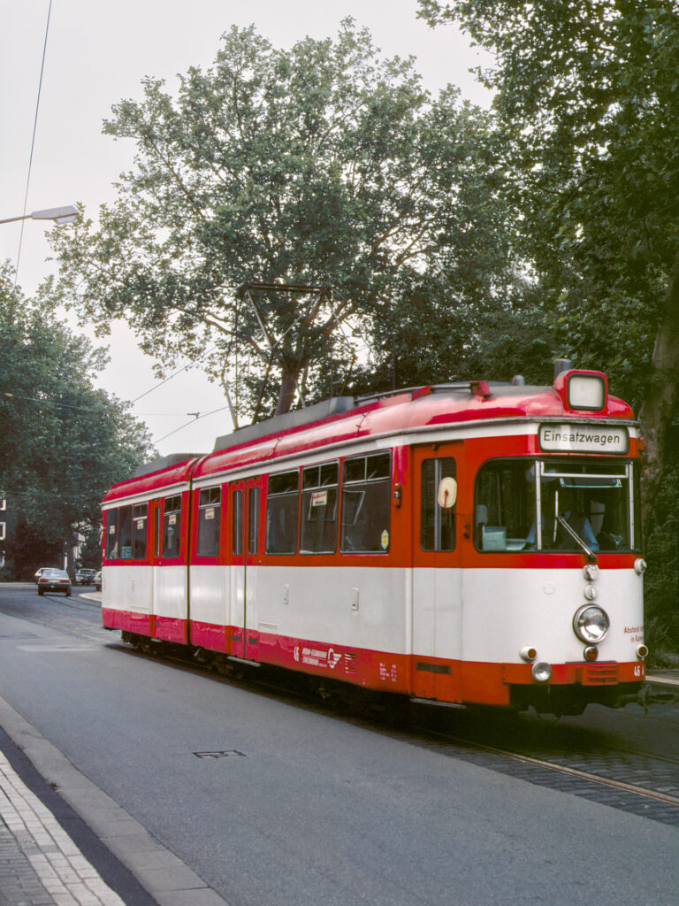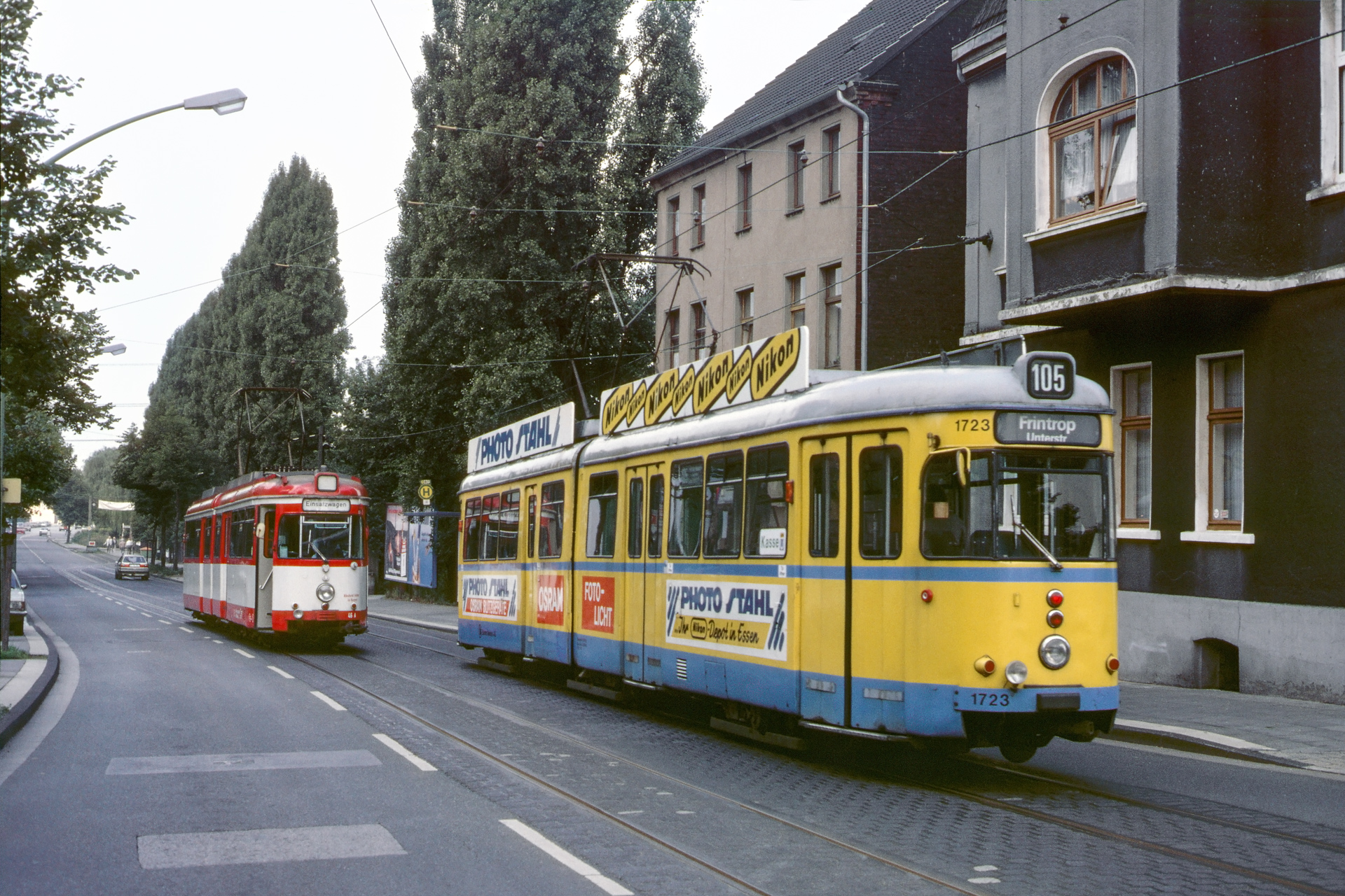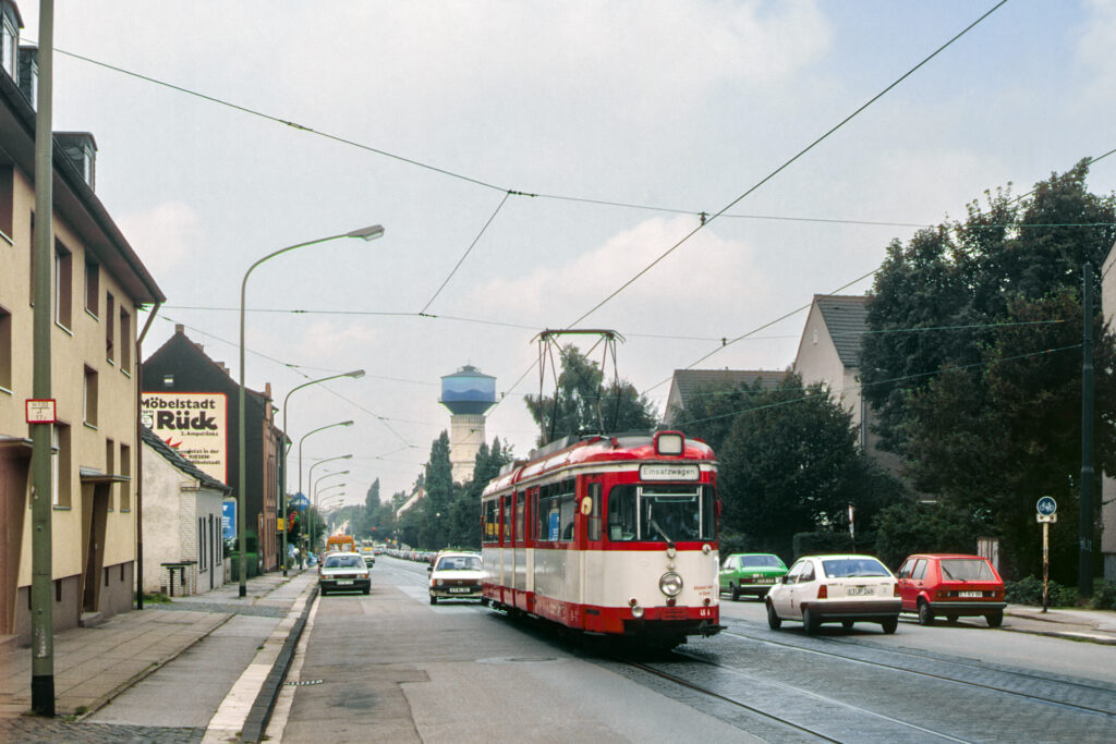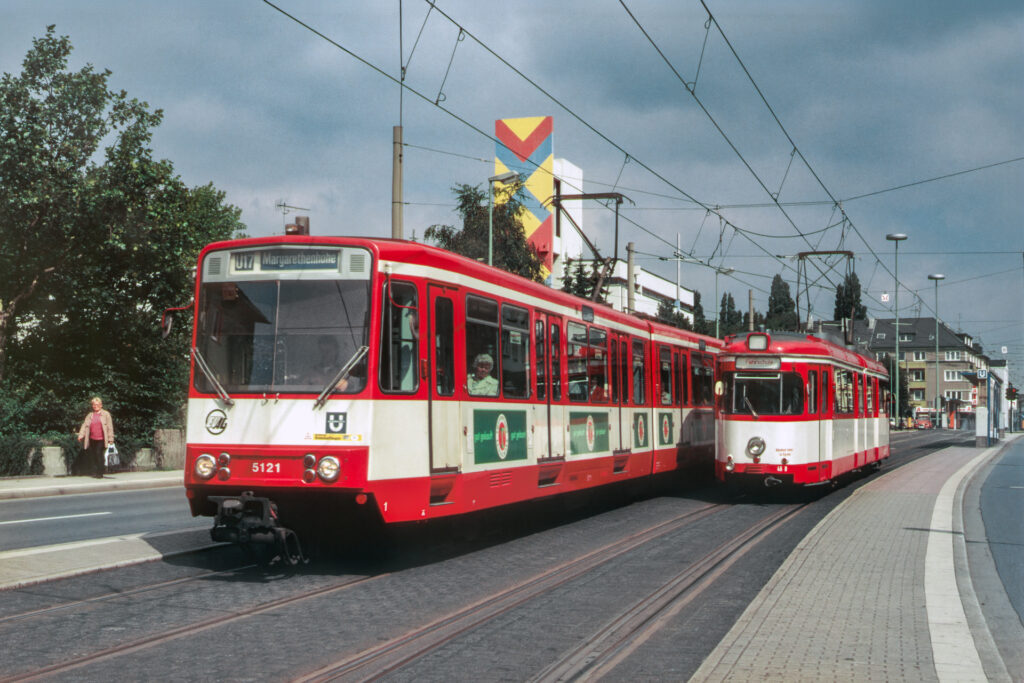 In Fahrtrichtung Rüttenscheid begegnet uns auf der Heinitzstraße kurz vor dem Bahnhof Essen West der Tw 105 der Bergischen Museumsbahnen. Der war damals nach Essen ausgeliehen und wurde auf den „Maitember“ Rundfahrten eingesetzt.Noch ein Foto dieser BegegnungJetzt sind wir in die andere Richtung unterwegs, und zwar vor dem Universitätsklinikum kurz vor der Einfahrt in die Schleife Holsterhauser Platz