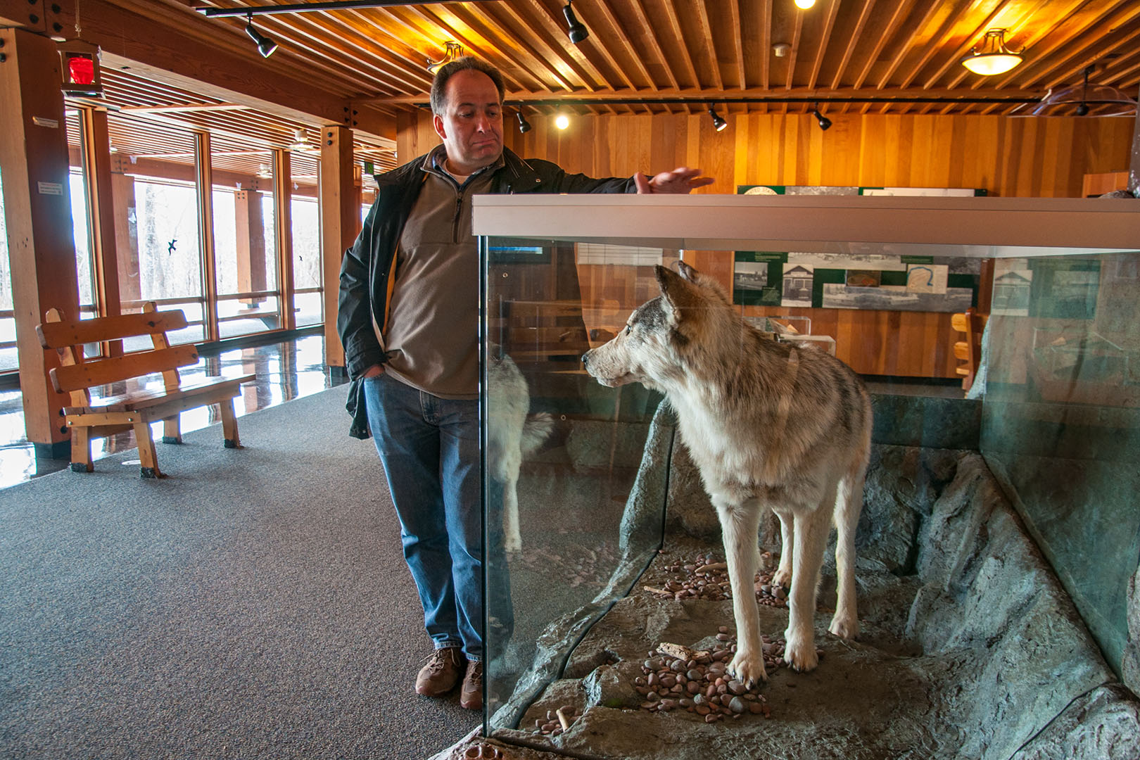 Nach einer Stunde erreichten wir den ca 50 Meilen von Duluth entfernten State Park. Die Wasserfälle liegen direkt an der Straße, die Brücke führt zwischen den Upper und Middle Falls über denGooseberry River, daher dient das Ganze auch als Raststätte und eine gewisse Zeit kann man kostenlos Parken. Wir entschieden uns mit der kostenlosen Zeit auszukommen und machten einen Kurzbesuch. Zunächst ging es ins Visitor Center, dort findet man u.a. einen ausgestopften Wolf: