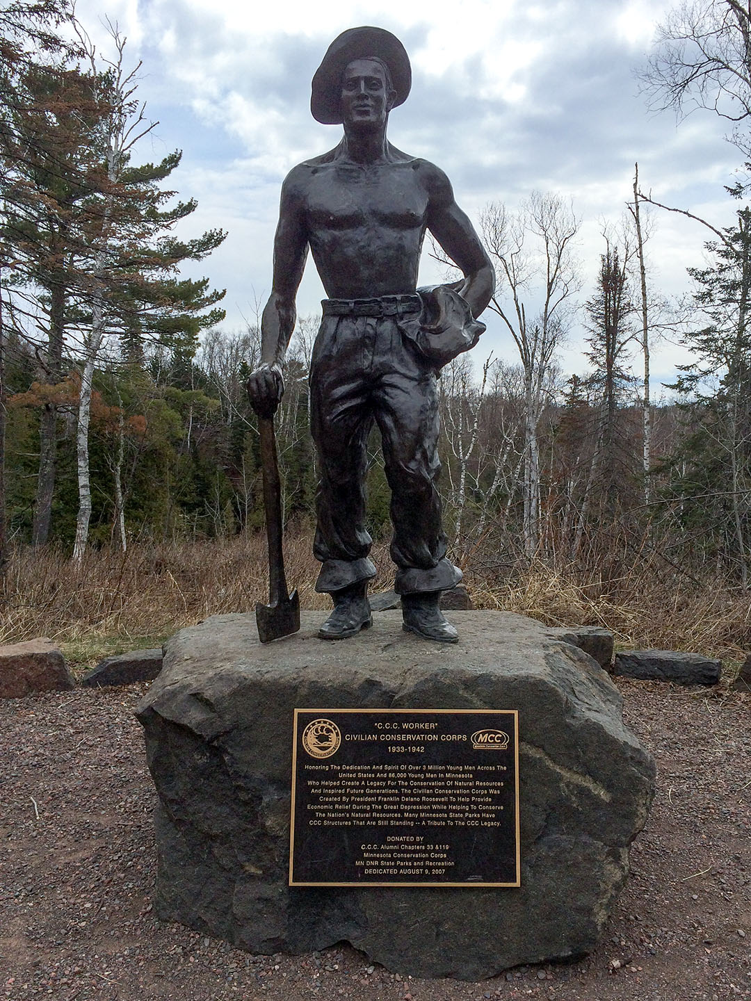 Diese Statue erinnert an das „Civilian Conservation Corps“, eine Arbeitsbeschaffungsmassnahme während der großen Depression, von dem viele Strukturen in den Nationalparks und State Parks gebaut wurden, vermutlich auch hier.