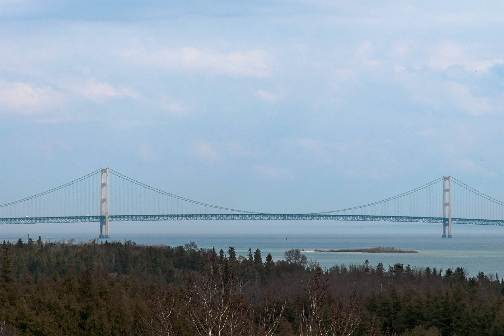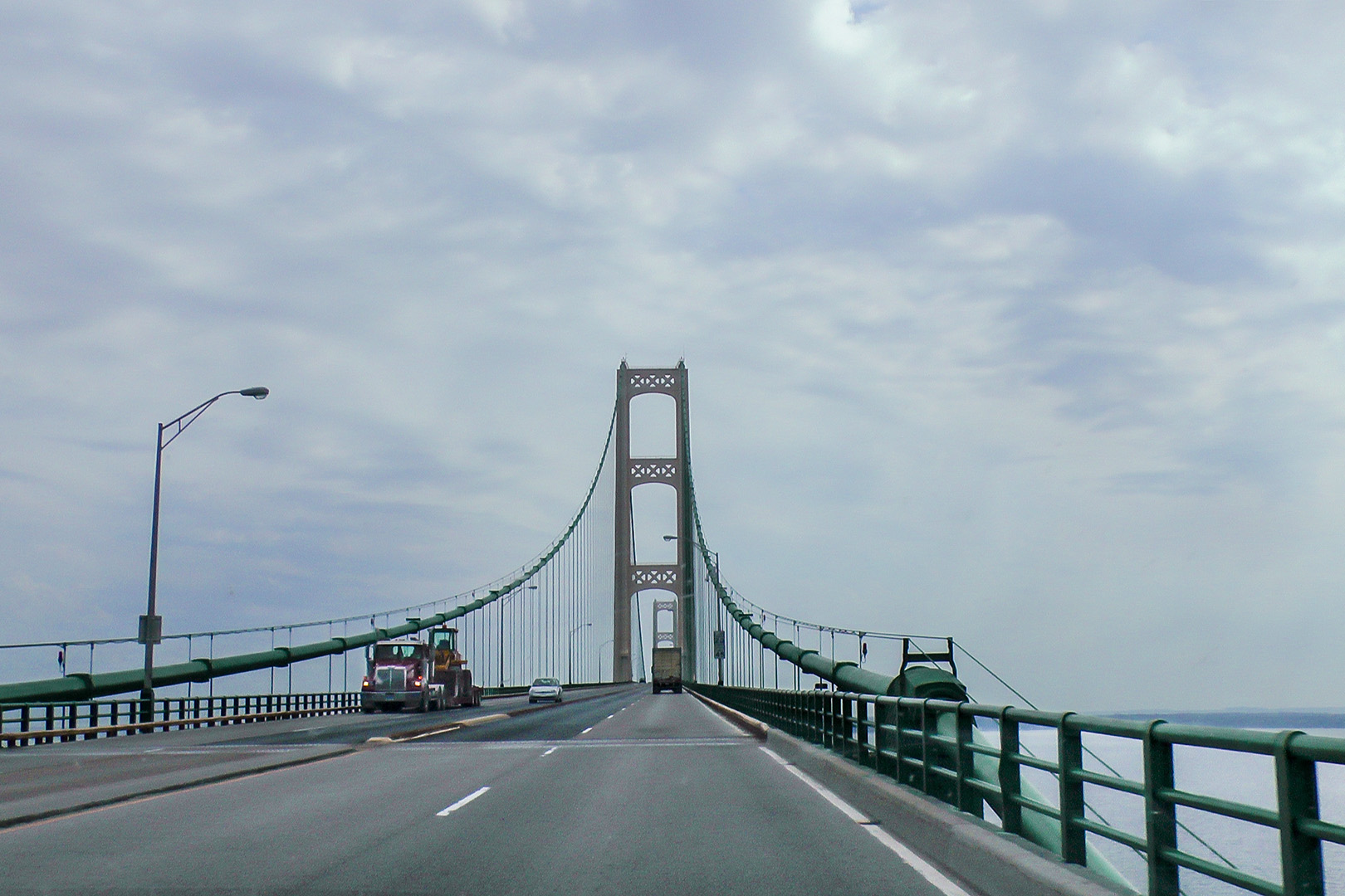 Jetzt fing auch mein Magen an Probleme zu bereiten. Auf einem Rastplatz hatten wir einen ersten Blick auf den Lake Michigan und die Mackinac Bridge. Praktisch an der Stelle der Brücke ist die Grenze zwischen dem Michigan und dem Huron See.