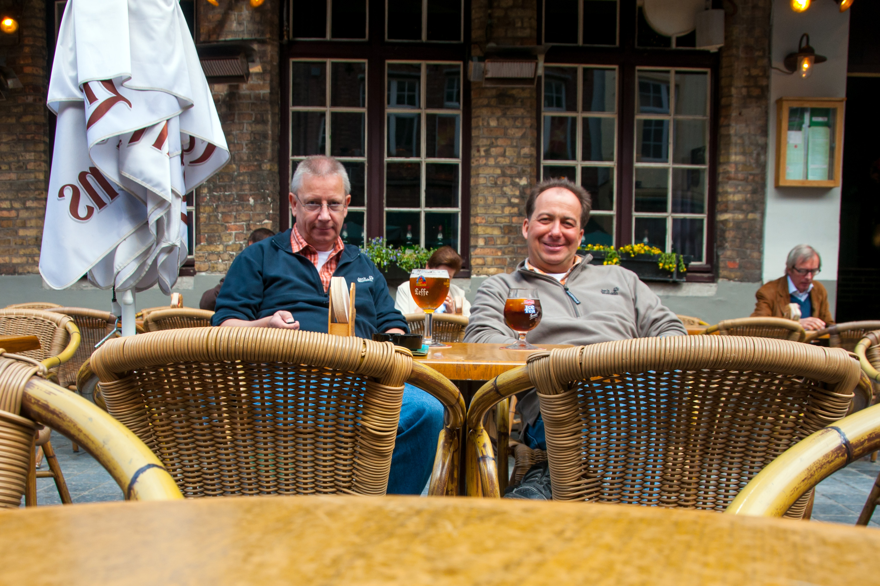 Auf dem Weg zum ‚Grote Markt‘ an der Sint Amandsstraat. Der Belfried ragt über die HäuserGrote Markt / Sint AmandsstraatKutschen warten auf Touristen auf dem Grote MarktDie Markthallen mit dem BelfriedDetail des Belfried über dem TorDer Belfried vom Innenhof ausBlick vom Rozenhoedkai aus in Richtung InnenstadtBlick Richtung Jan van Eyckplein, der Turm gehört zur PoorterslogeAlte Häuser an der SpiegelreiSint AnnareiPause in einem Café am EiermarktBlick auf die Liebfrauenkirche (von Zonnekemers aus)Blick Richtung Beginenhof (von Zonnekemers aus)Kapelle und Kirche des Beginenhofs in BrüsselIn Zeebrugge vor der FähreWartenDie Fähre (Pride of Brugge)Blick vom Deck: Nebenan werden Frachtfähren beladenBlick vom Deck: Im Hintergrund liegt ein KreuzfahrtschiffUnsere Kabine