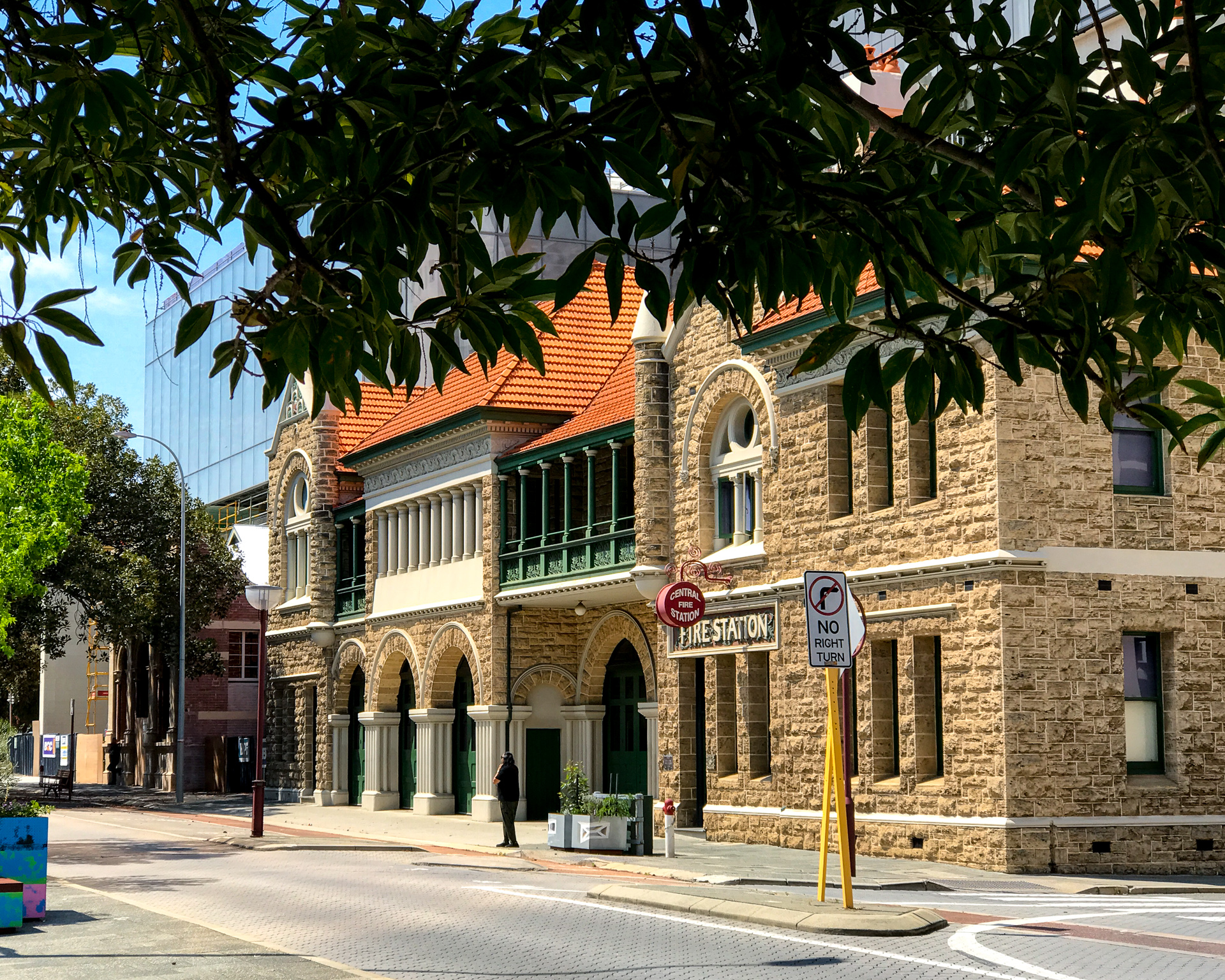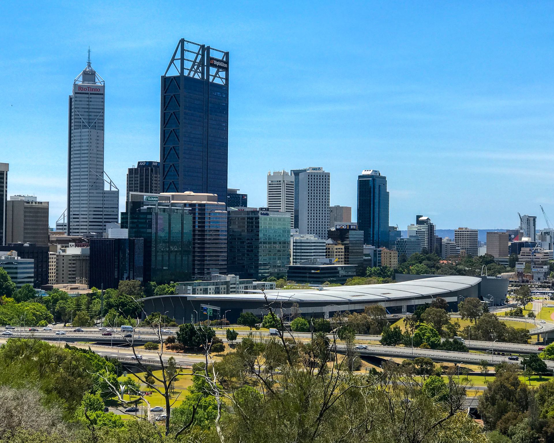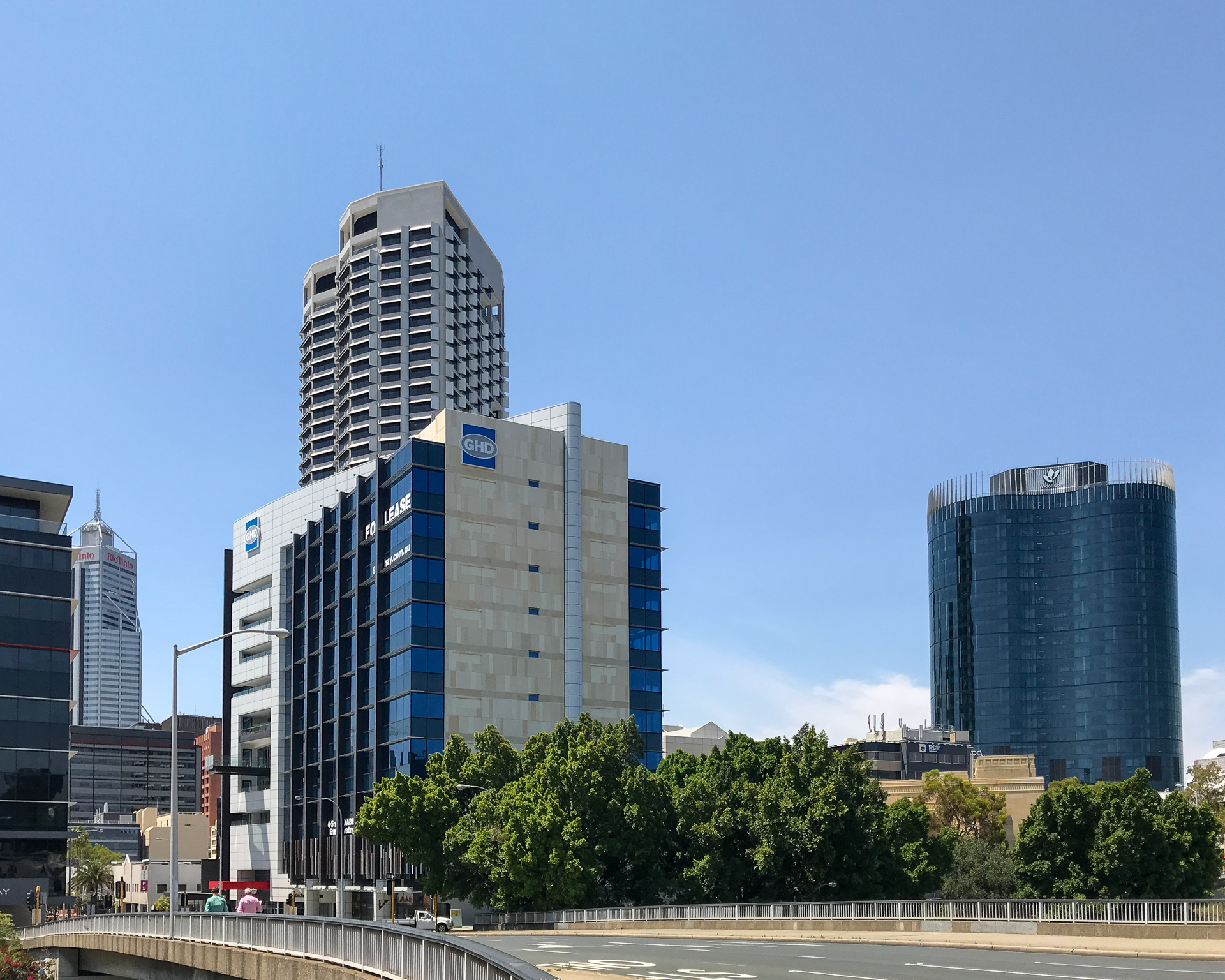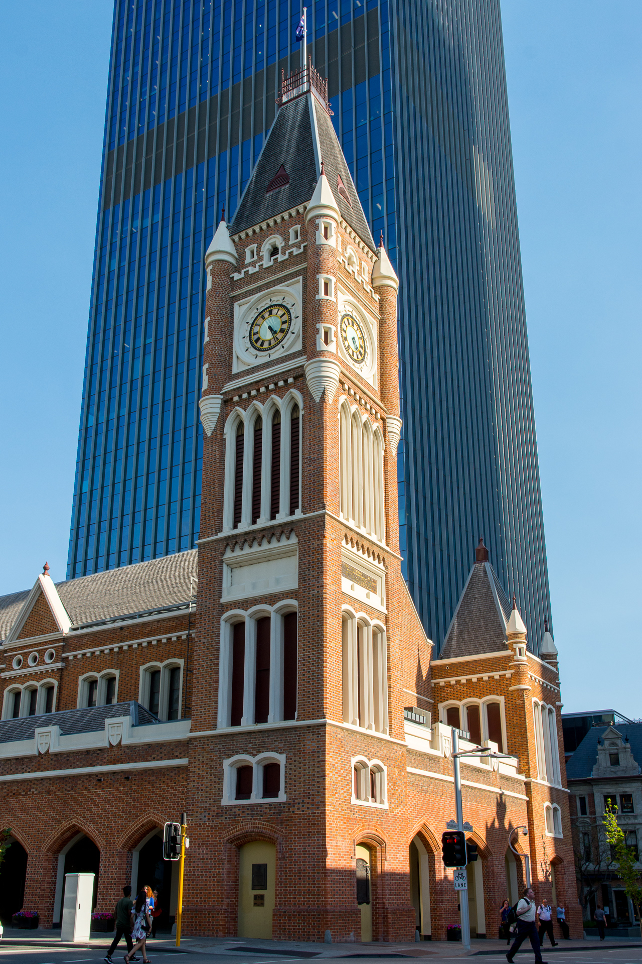 St. Georges CathedralSt. Mary’s CathedralVogelkäfige als Sitzgelegenheiten auf der Murray StreetPerth Central Fire Station von 1901 – als Feuerwache in Betrieb bis 1979ehemaliges Gebäude der Heilsarmee von 1903Government Printing Office, von 1894Die Ecke Murray Street/Pier Street, dieses Hotel gibt es dort seit 1971, das Gebäude scheint von 1911 zu seinDas ‚General Post Office’auf dem zentralen Forrest Place,1923 fertiggestellt und bis 2016 von der Post benutztDer Forrest Place, hinter den Bäumen befindet sich der Bahnhof von Perth. Die Skulptur davor wird üblicherweise „The Cactus“ genannt, offizieller Titel ist wohl „Grow Your Own“Von der Hay Street jenseits der Autobahn 2 gesehen: Die City von WestenDas Parlament des Staates West AustralienFraser Avenue, die Zufahrt zum Kings ParkKings Park
