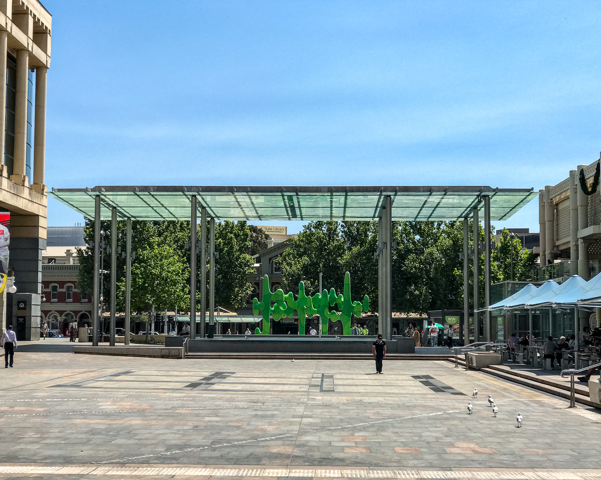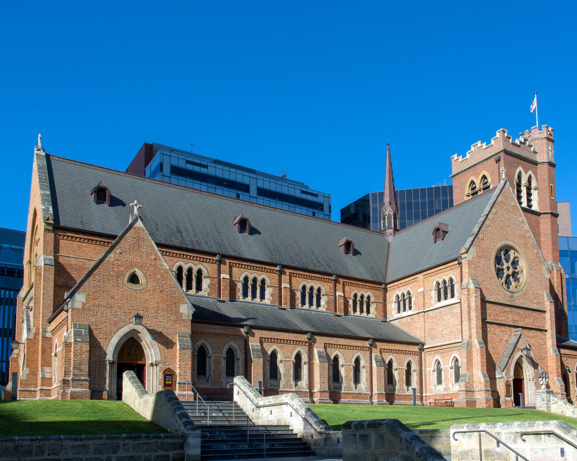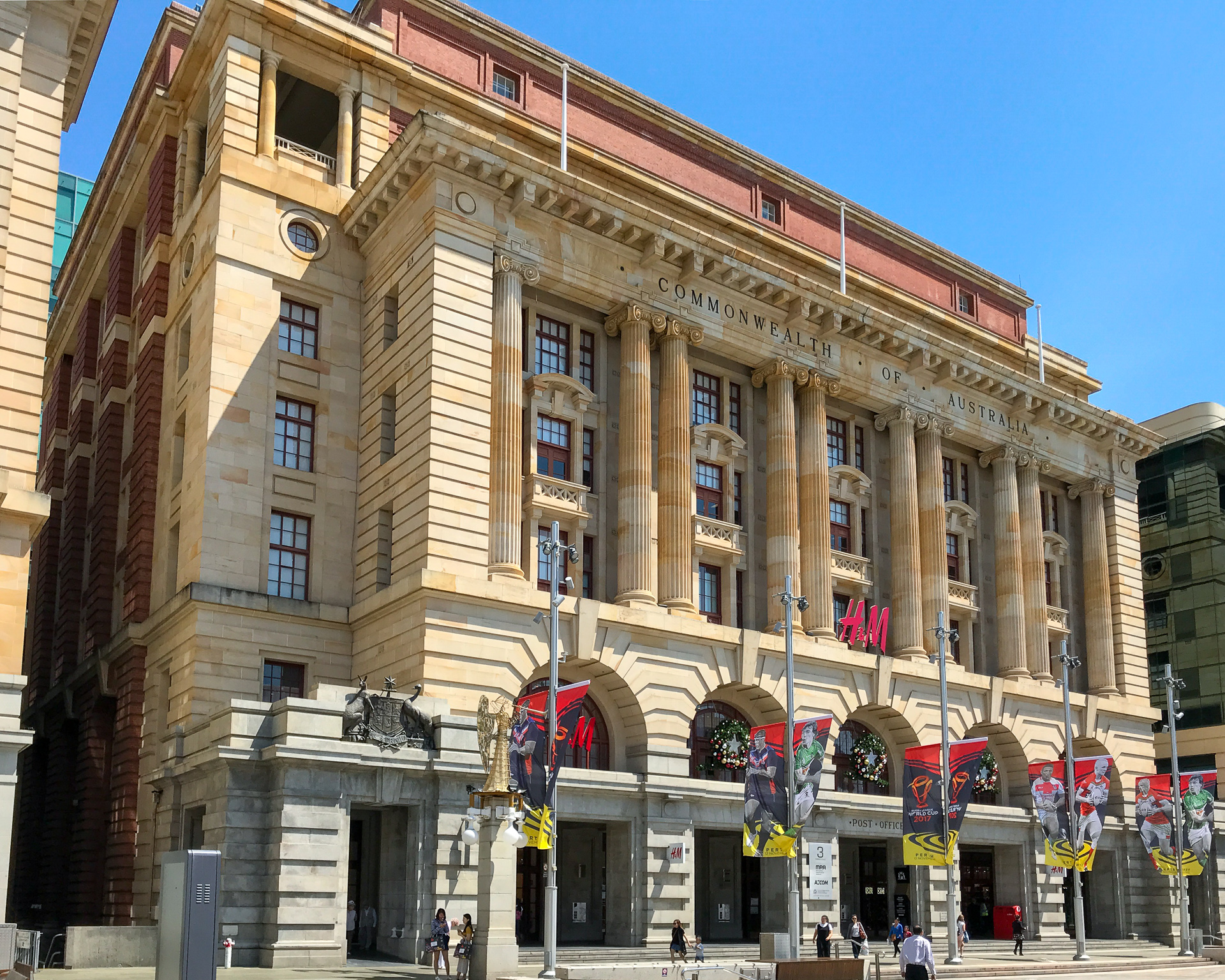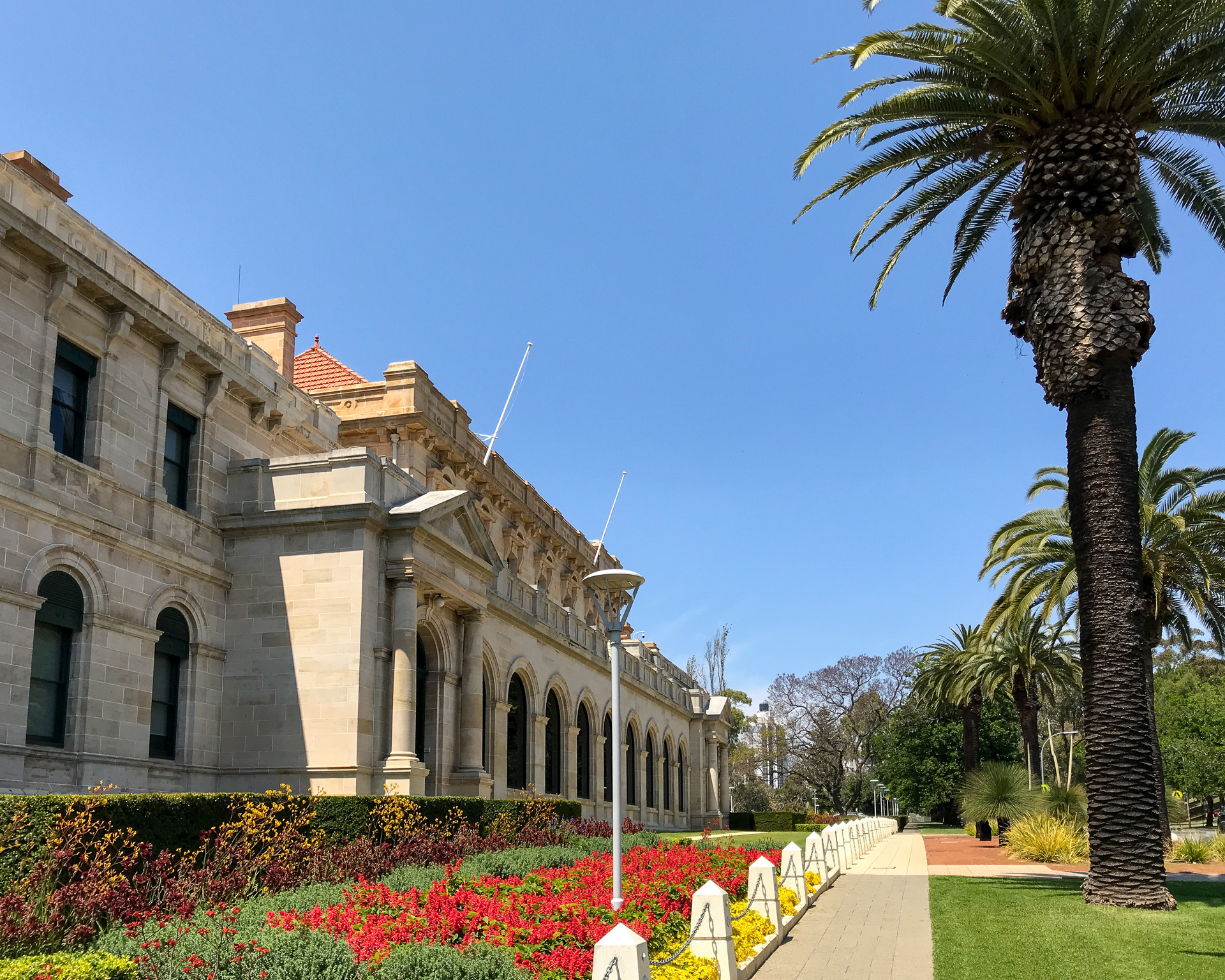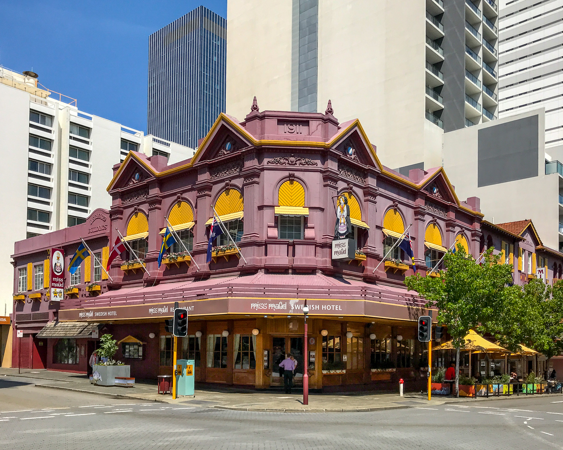 St. Georges CathedralSt. Mary’s CathedralVogelkäfige als Sitzgelegenheiten auf der Murray StreetPerth Central Fire Station von 1901 – als Feuerwache in Betrieb bis 1979ehemaliges Gebäude der Heilsarmee von 1903Government Printing Office, von 1894Die Ecke Murray Street/Pier Street, dieses Hotel gibt es dort seit 1971, das Gebäude scheint von 1911 zu seinDas ‚General Post Office’auf dem zentralen Forrest Place,1923 fertiggestellt und bis 2016 von der Post benutztDer Forrest Place, hinter den Bäumen befindet sich der Bahnhof von Perth. Die Skulptur davor wird üblicherweise „The Cactus“ genannt, offizieller Titel ist wohl „Grow Your Own“Von der Hay Street jenseits der Autobahn 2 gesehen: Die City von WestenDas Parlament des Staates West AustralienFraser Avenue, die Zufahrt zum Kings ParkKings Park