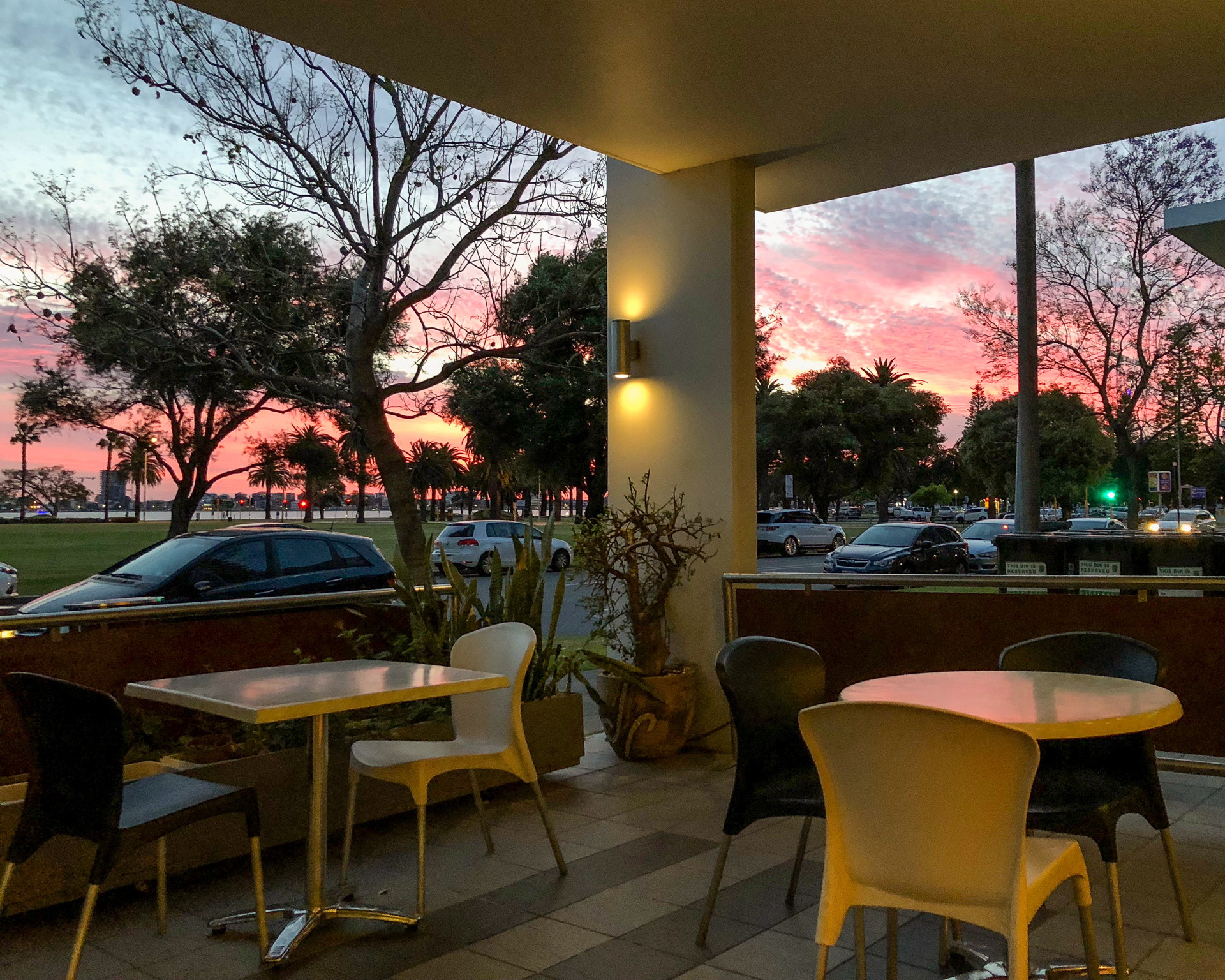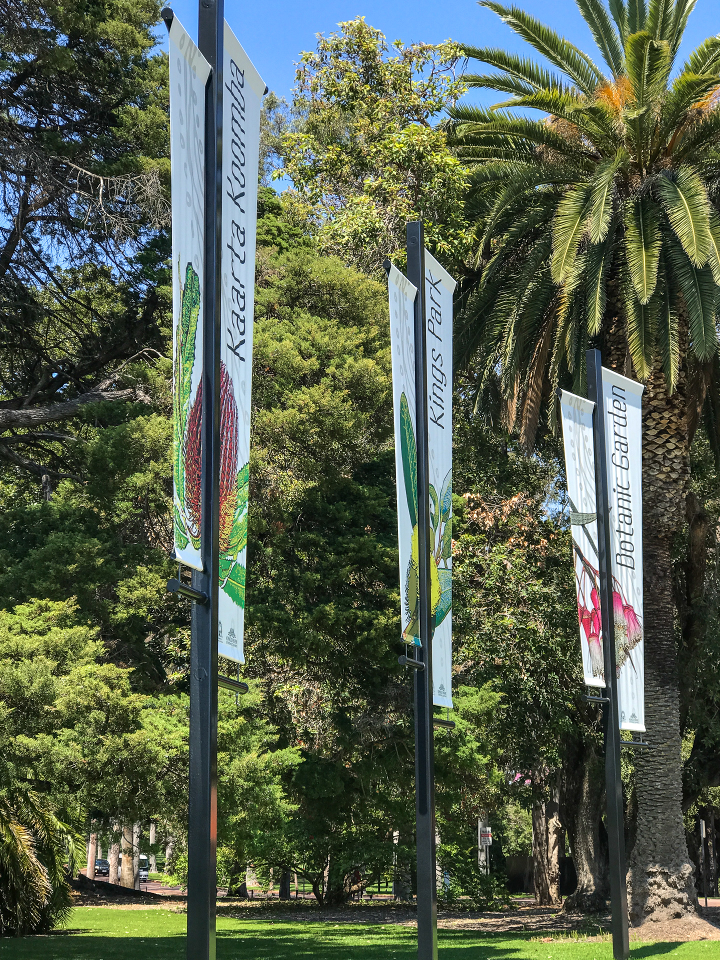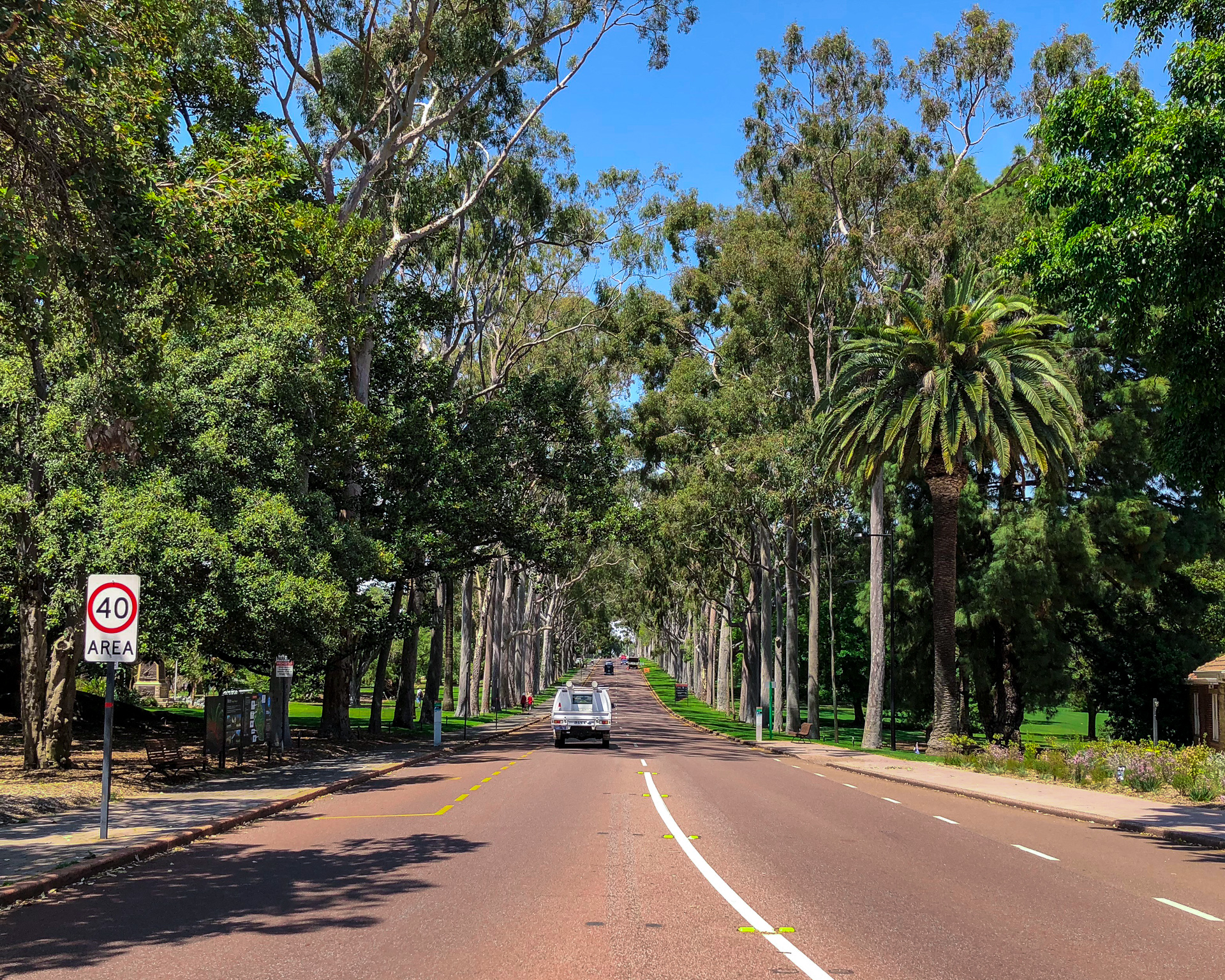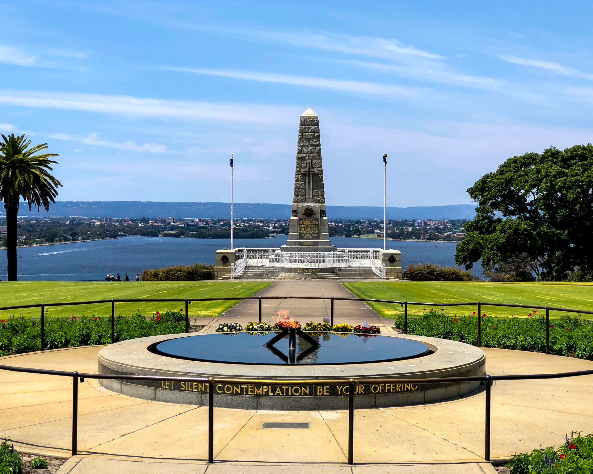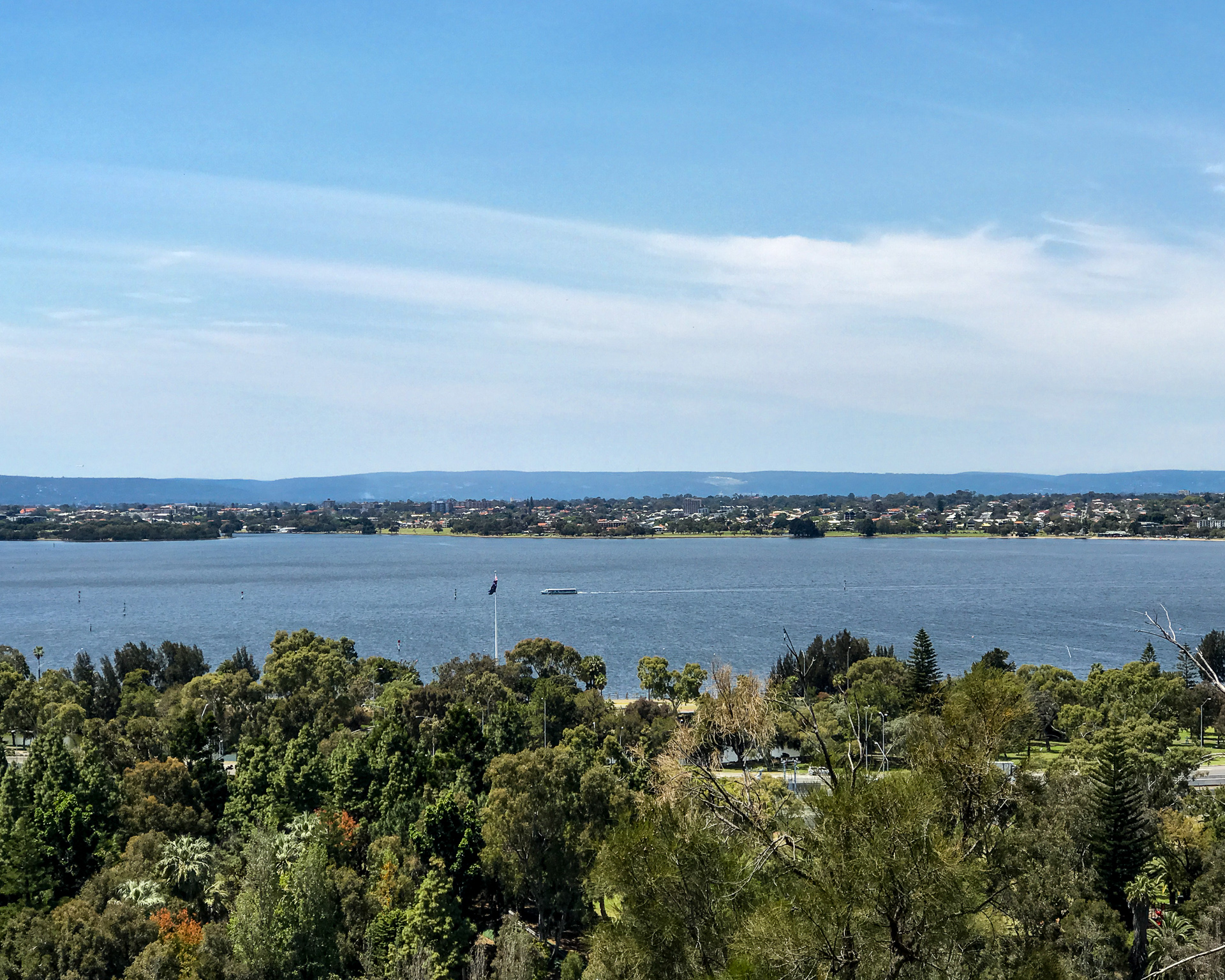South African War MemorialQueen VictoriaState War MemorialBlick über den Swan River nach South PerthDer Central Business District vom Kings Park aus. Das flache Gebäude vor der Skyline ist das Perth Convention and Exhibition Centre„Abstieg“ zum FlussJohn Oldham Park inmitten der Zu- und Abfahrten der ‚Narrows Bridge approach and interchange‘ StraßenkreuzungDas Rathaus von PerthEinen Preis für „Best Views“ gabs, aber nicht für gutes Essen: Blick über die Terasse des „Southern Star“ Restaurant auf den Sonnenuntergang