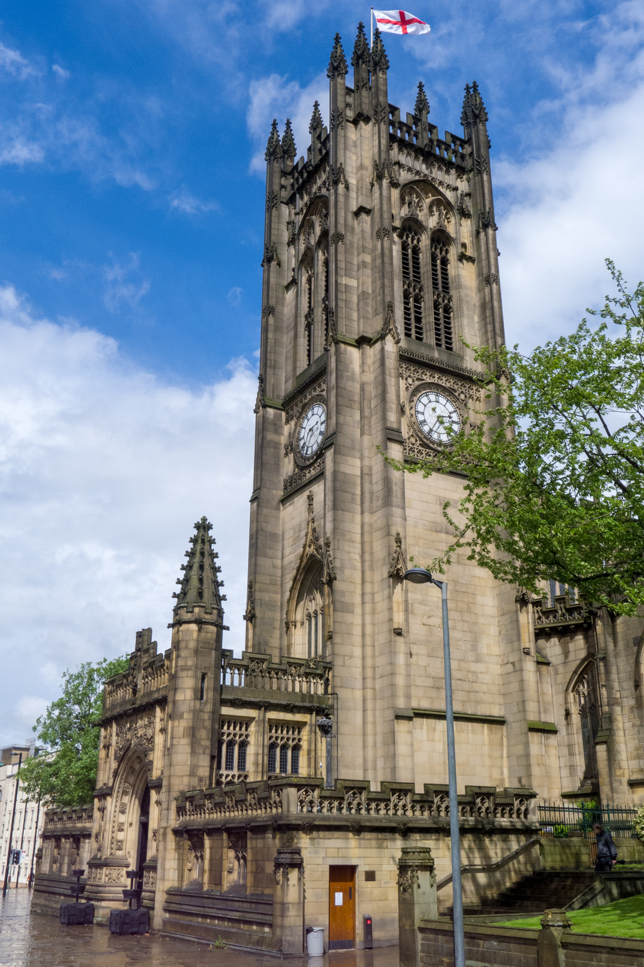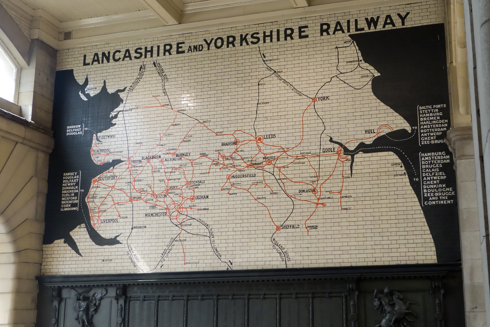 Manchester CathedralNähe Exchange SquareManchester Victoria Station. Die Lancashire and Yorkshire Railway erbaute den Bahnhof, die Karte mit dem Netz dieser Gesellschaft hat sich bis heute erhaltenFahrkartenschalter in der Manchester Victoria Station
