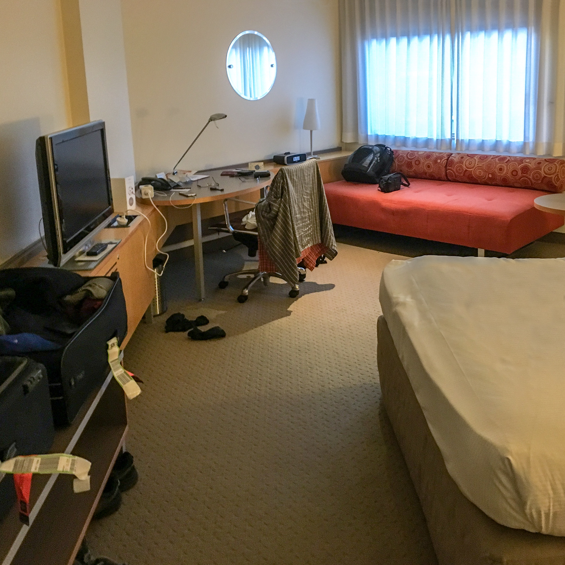 Gegen einen geringen Zuschlag kann man Zimmer ab vormittags buchen, was wir auch getan hatten, aber da alles so superpünktlich abgelaufen war, standen wir trotzdem zwei Stunden zu früh an der Rezeption. Es war aber kein Problem, es gab ein Zimmer für uns.