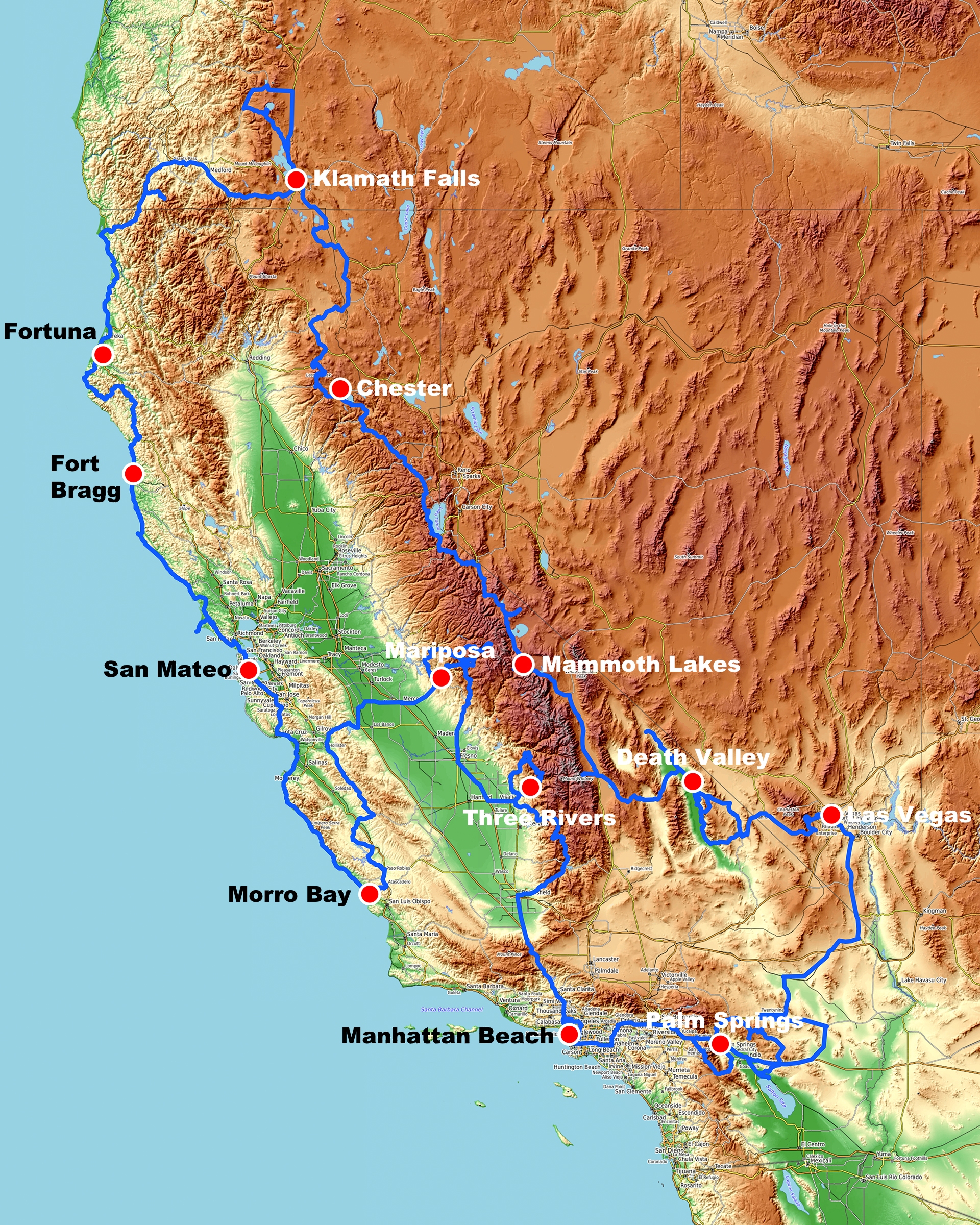 Gefahren sind wir im Uhrzeigersinn. Zunächst ging es nach dem Aufenthalt in Los Angeles nordwärts über Sequoia und Yosemite Nationalparks sowie die Küstenstrasse (Highway 1) bis San Mateo. Von dort aus besichtigten wir dann San Francisco, anschließend ging die Weiterfahrt nordwärts entlang der Küste bis Klamath Falls in Oregon. Dort war praktisch der Wendepunkt, nach einem Ausflug zum Crater Lake Nationalpark ging es zurück südwärts auf der Ostseite der Cascades und der Sierra Nevada bis Mammoth Lakes. Danach dann endlich in warme Gegenden, über Death Valley und Las Vegas nach Palm Springs zu unserem mehrtägigen Badeaufenthalt, und schlussendlich zurück nach Los Angeles.