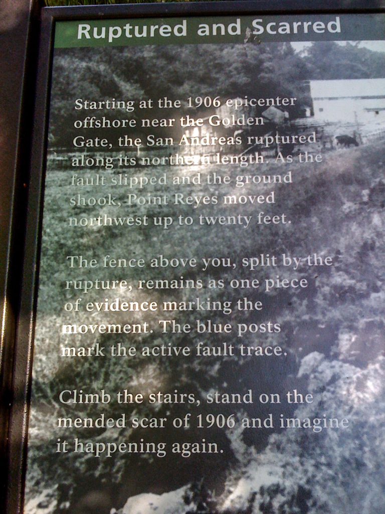 Nach einiger Zeit erreichen wir dann die Point Reyes Halbinsel. Zunächst besuchen wir das Visitor Center und wandern entlang des ‚Earthquake Trails’. Er veranschaulicht eindrucksvoll die Gefahren der San Andreas Fault, welche die Halbinsel vom ‚Festland‘ trennt, und man kommt an der berühmten Stelle vorbei, an der ein Zaun beim Erdbeben von 1906 um 6 m versetzt wurde.
