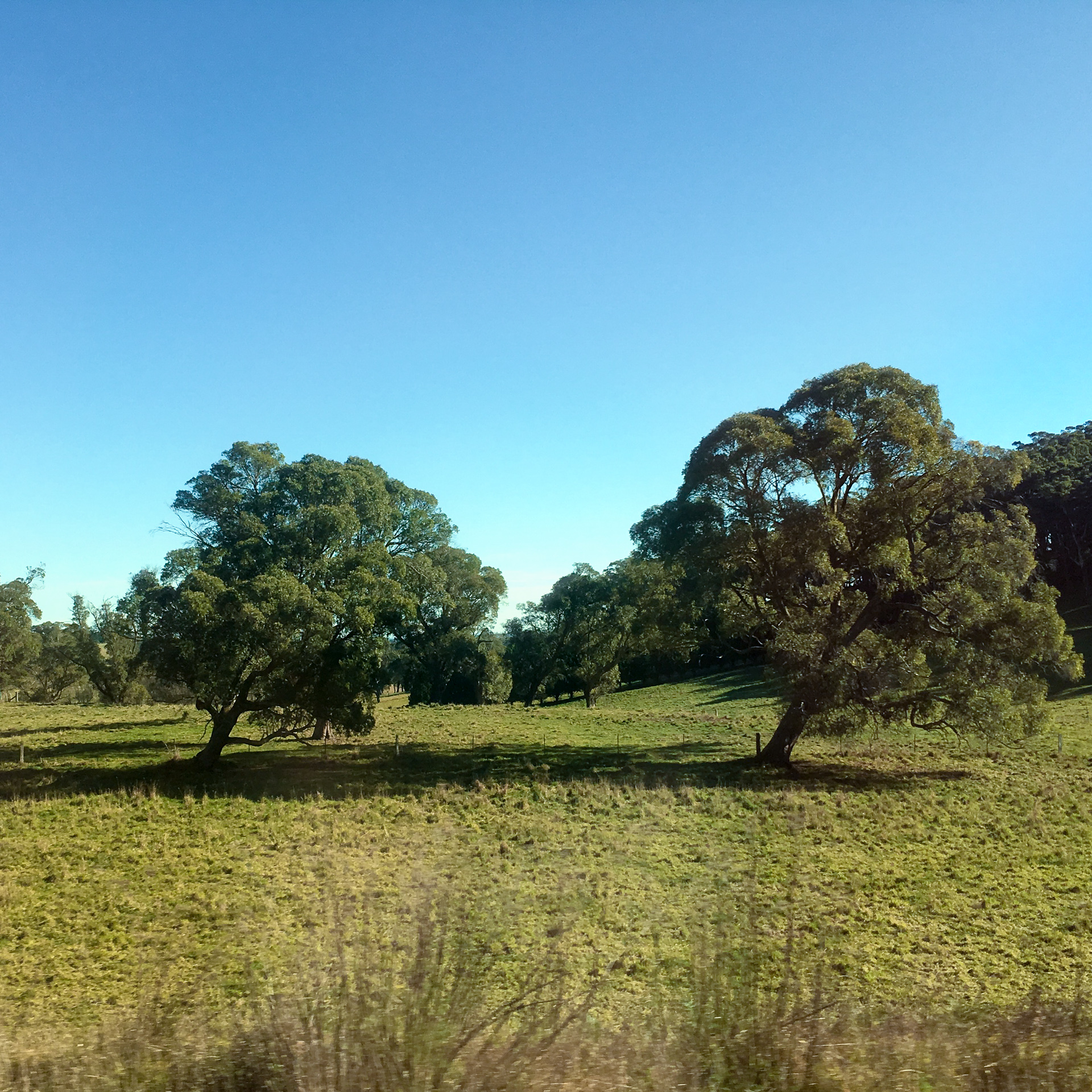 Die Bahnfahrt ist recht interessant, aber länglich. Versuche, die Landschaft fotographisch festzuhalten, scheitern an den Spiegelungen im Fenster. Die folgenden Fotos entstanden im ersten Teil der Reise „kurz“ hinter Sydney.