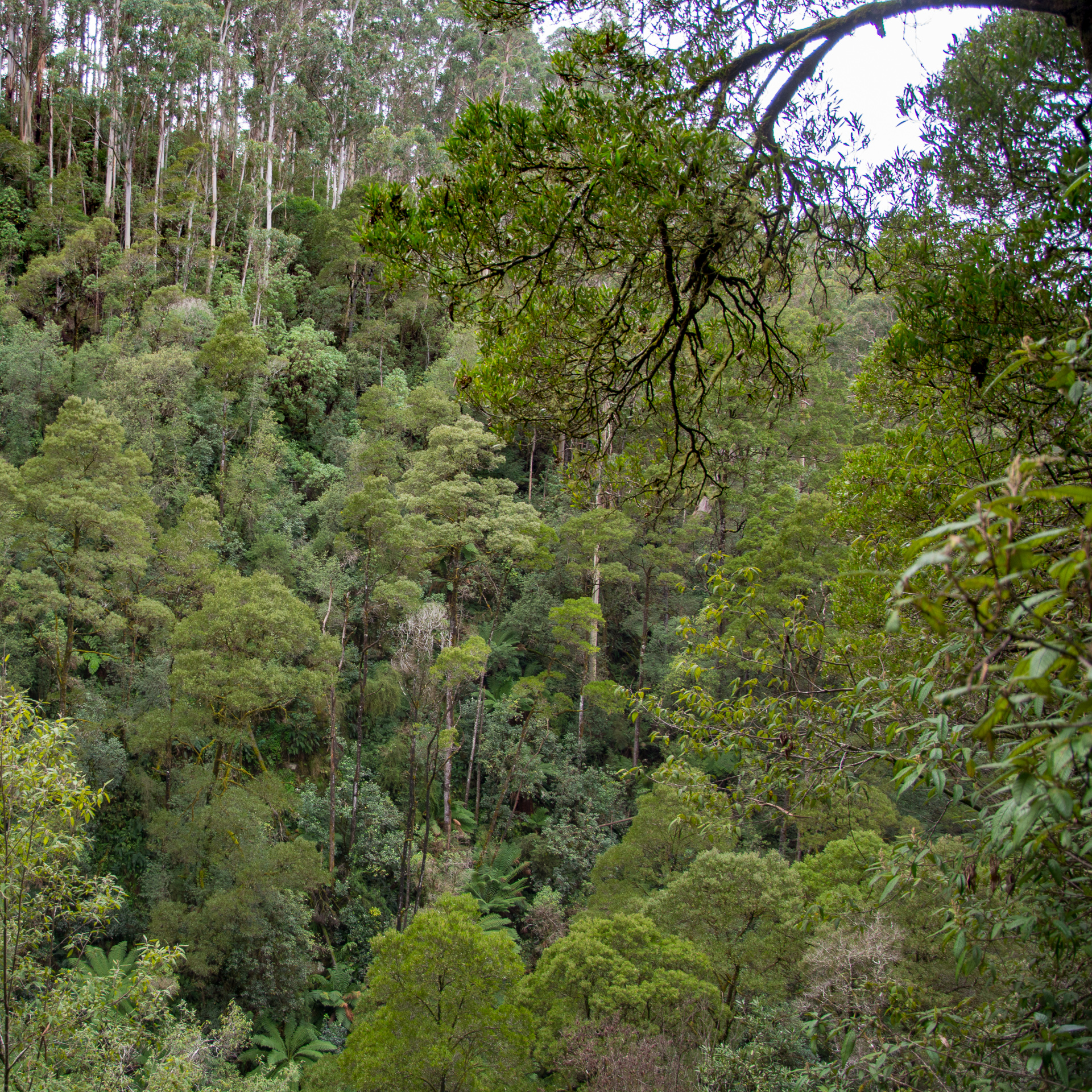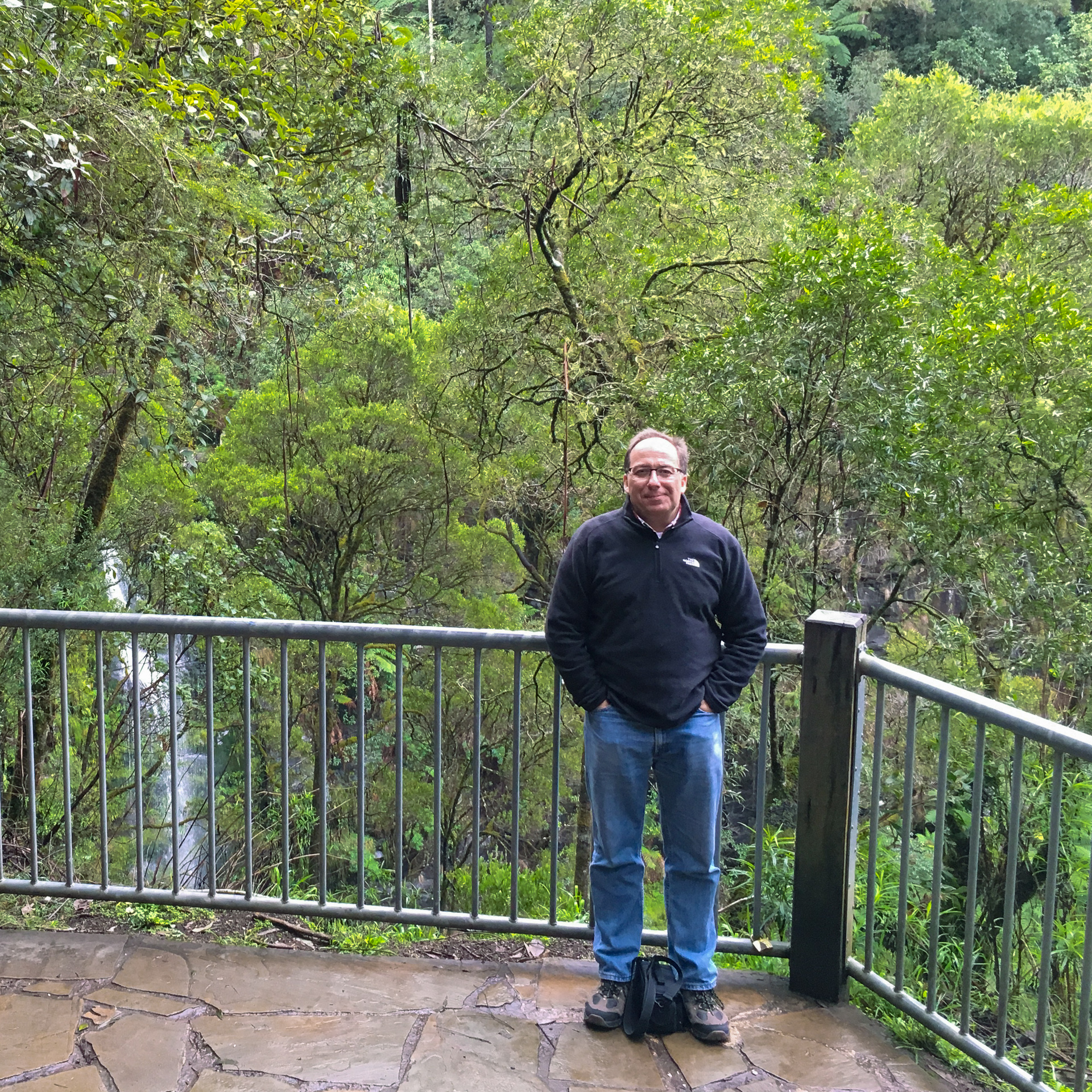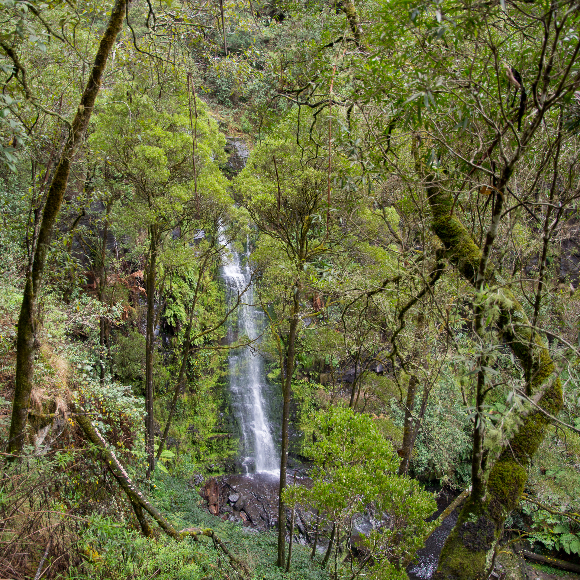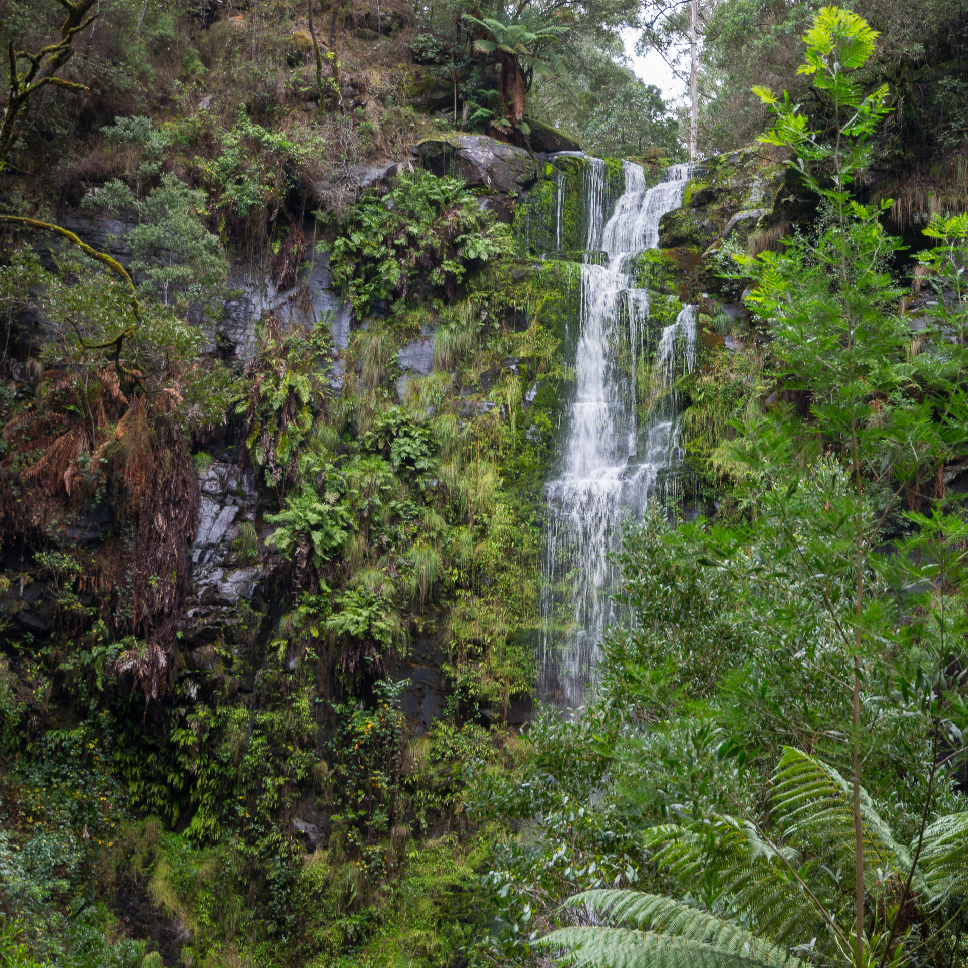 Bei der Auto Anmietung lagen ein paar Broschüren über Attraktionen in Victoria herum, die ich mitgenommen hatte und nun durchblättere um etwas Interessantes entlang der Route zu finden. Ich hab dann die Idee, einen der vielen Wasserfälle im Hinterland zu besuchen. Es sollen die Erskine Fälle werden. Die erste versuchte Abzweigung von der Küstenstraße führt in die Irre, aber dann erwischen wir die richtige Straße und landen mitten im Regenwald. So um 14 Uhr erreichen wir den Parkplatz an den Fällen.