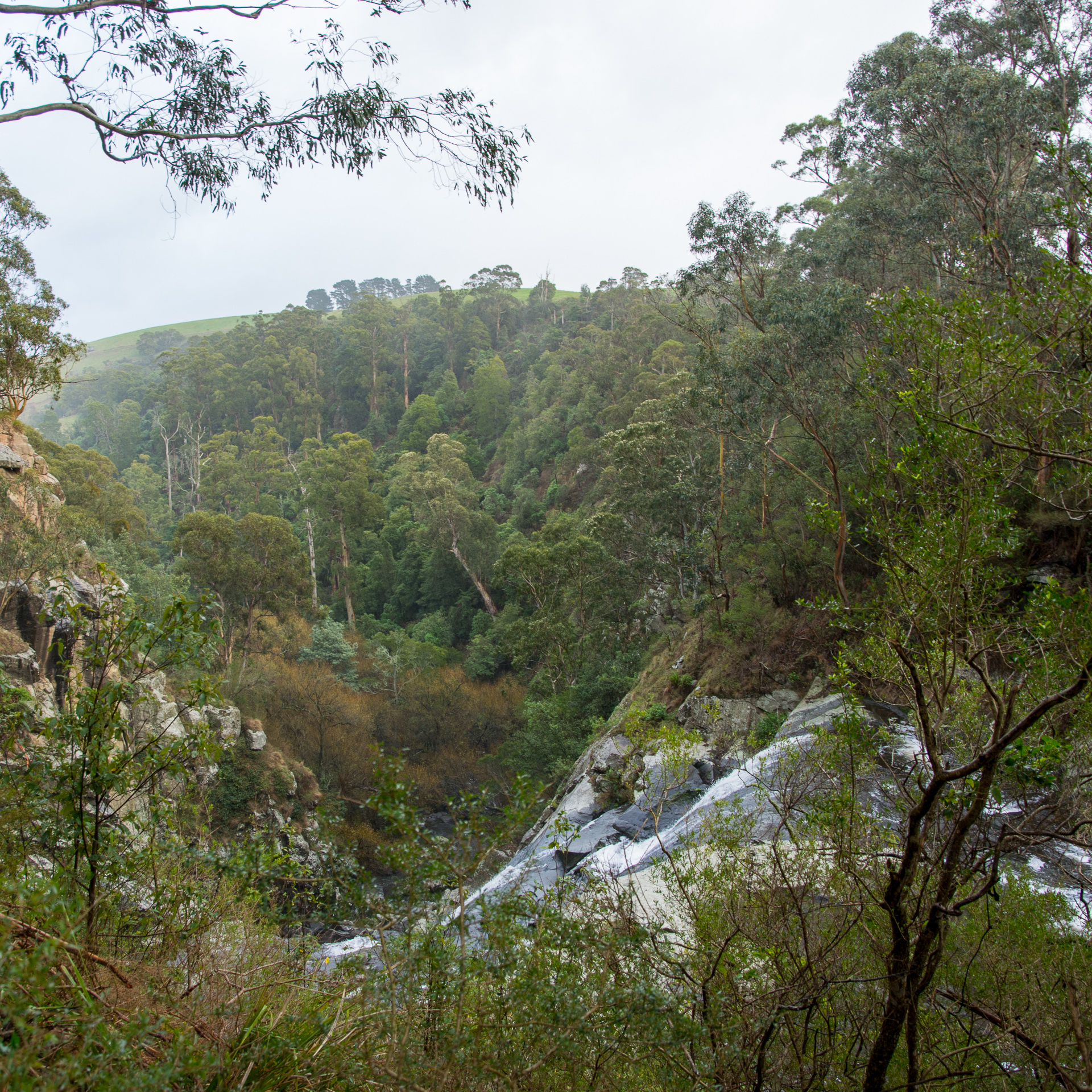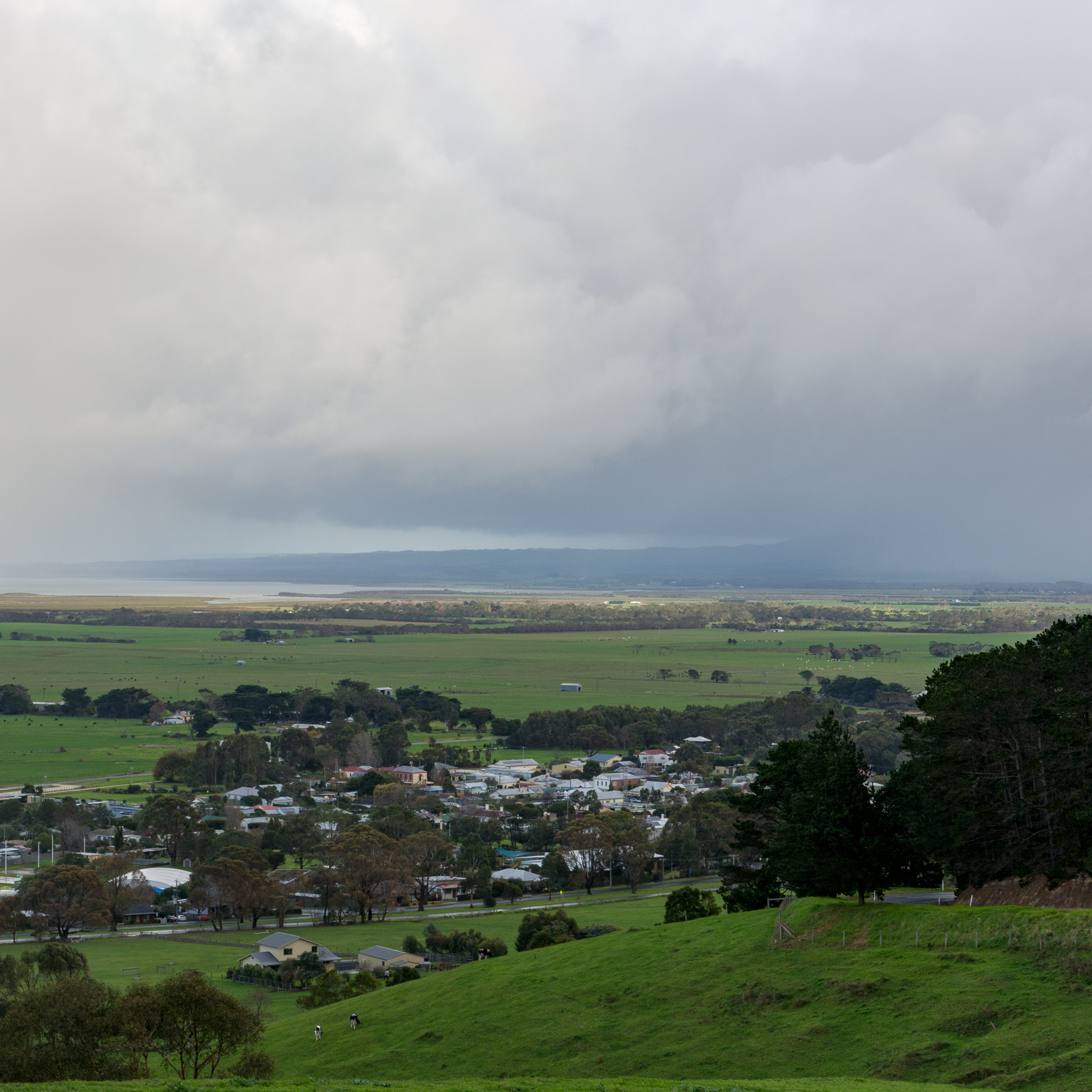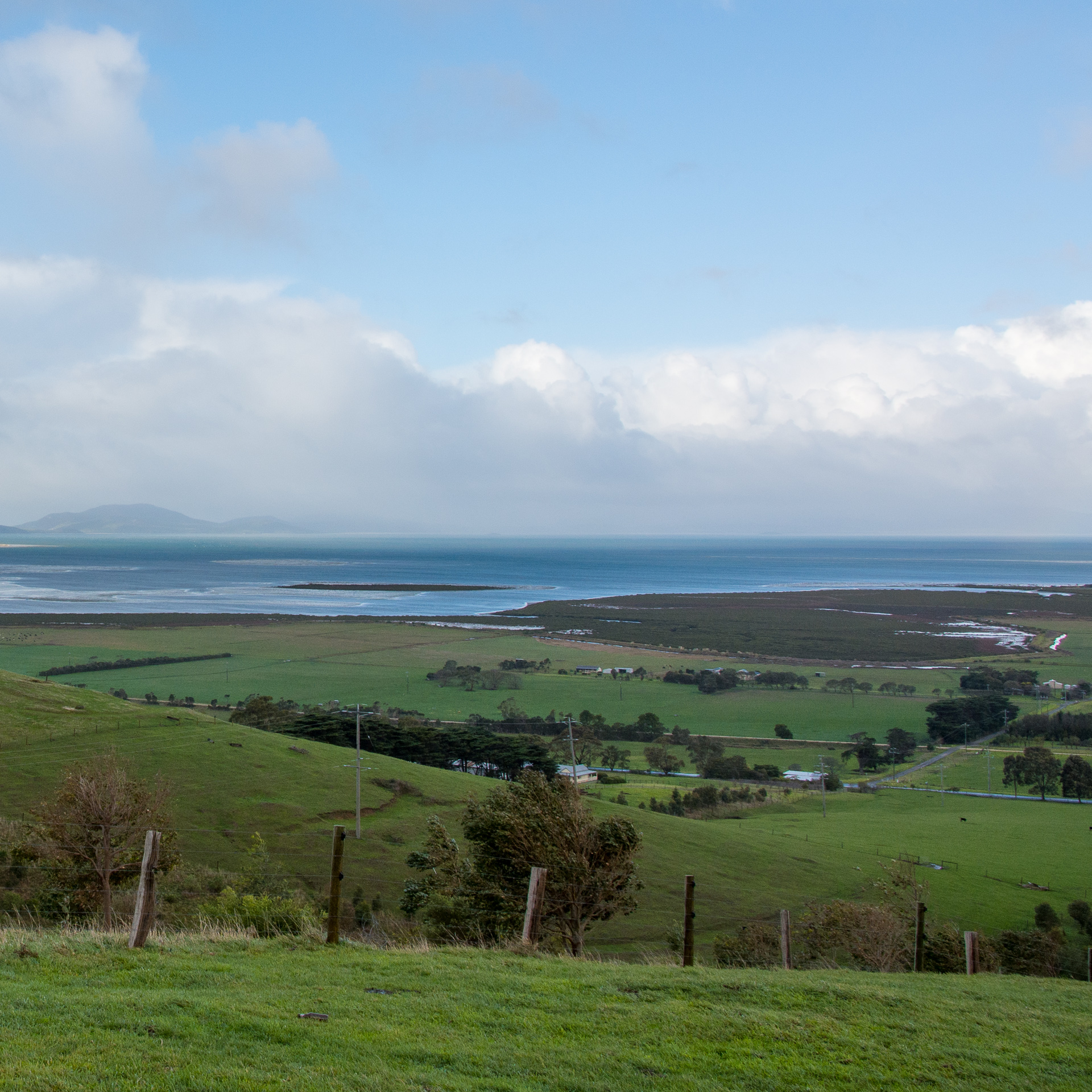 Weiter ging es nach Toora, mit über 600 Einwohnern deutlich größer, aber mit ähnlicher Geschichte, und auf die andere Seite des South Gippsland Highway in die Berge. Dort gibt es am Agnes River einen Wasserfall, die Agnes Falls. Zunächst haben wir Am Sillcocks Hill Lookout angehalten und auf die Ebene und das Corner Inlet unter uns zurück geblickt: