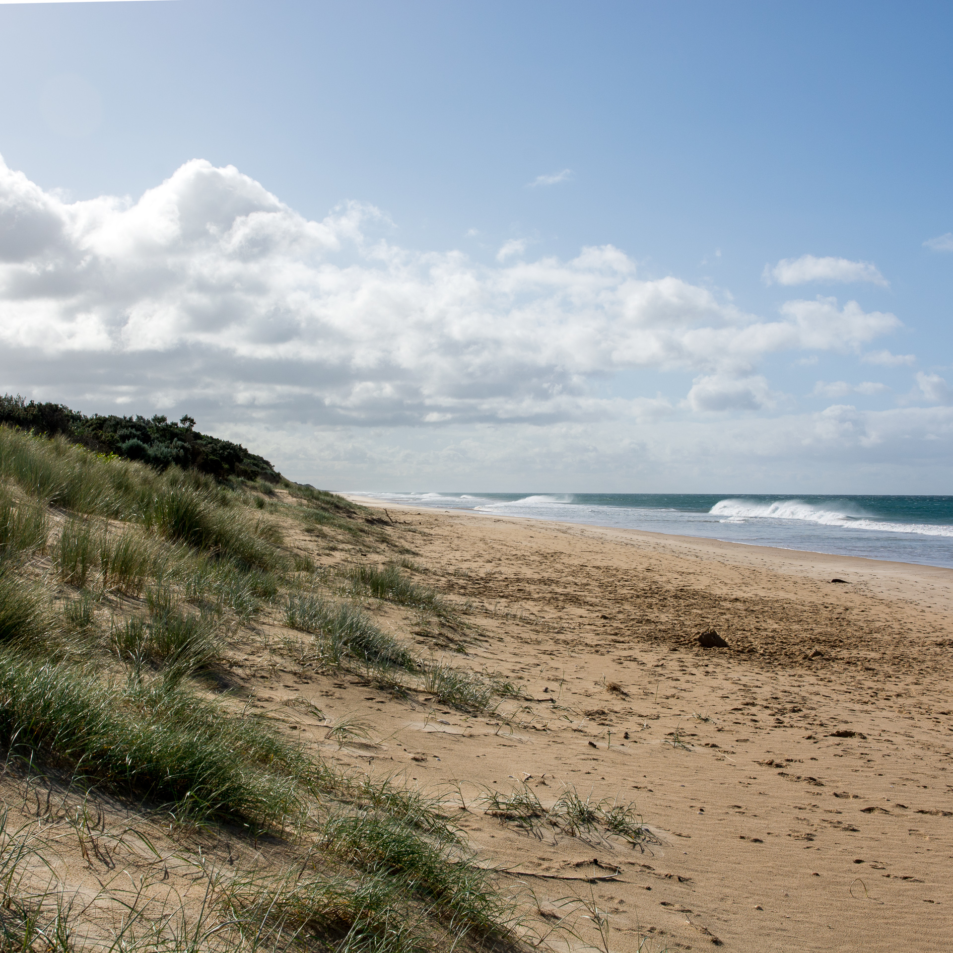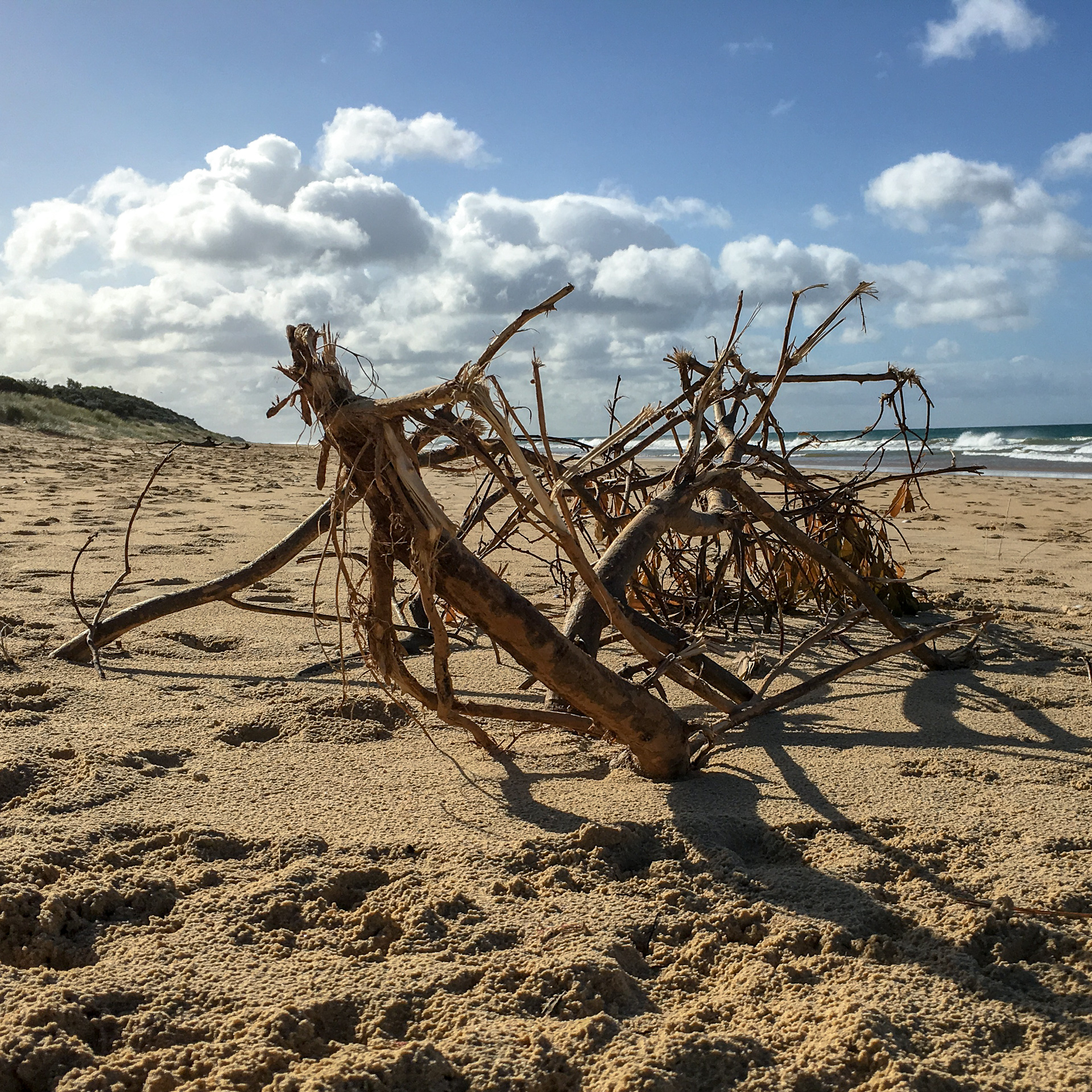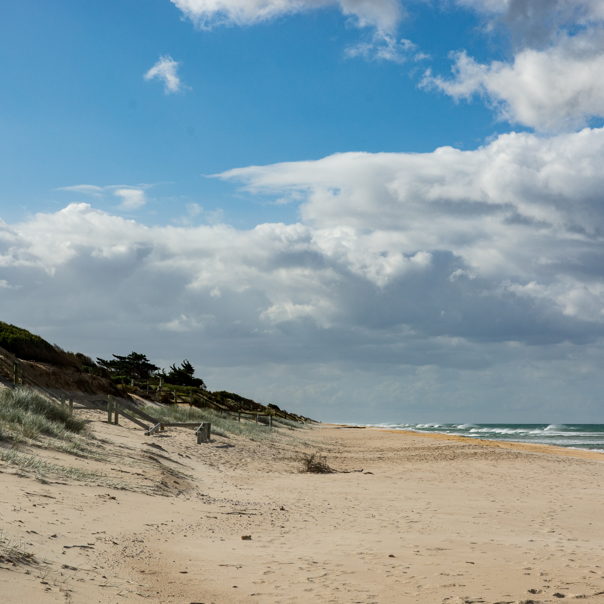Nach dem Besuch an den Agnes Falls geht es wieder herunter zum Gippsland Highway, unser nächstes Ziel ist der ’90 Mile Beach‘. Tatsächlich ist er 94 Meilen (= 151 Kilometer) lang und soll damit der viertlängste Strand der Welt sein. Das erste Ma treffen wir auf diesen Strand nahe am südlichen Ende, in Woodside Beach. Vom touristischen Trubel der Sommermonate ist nichts zu bemerken, wir sind fast die Einzigen auf dem Strand.