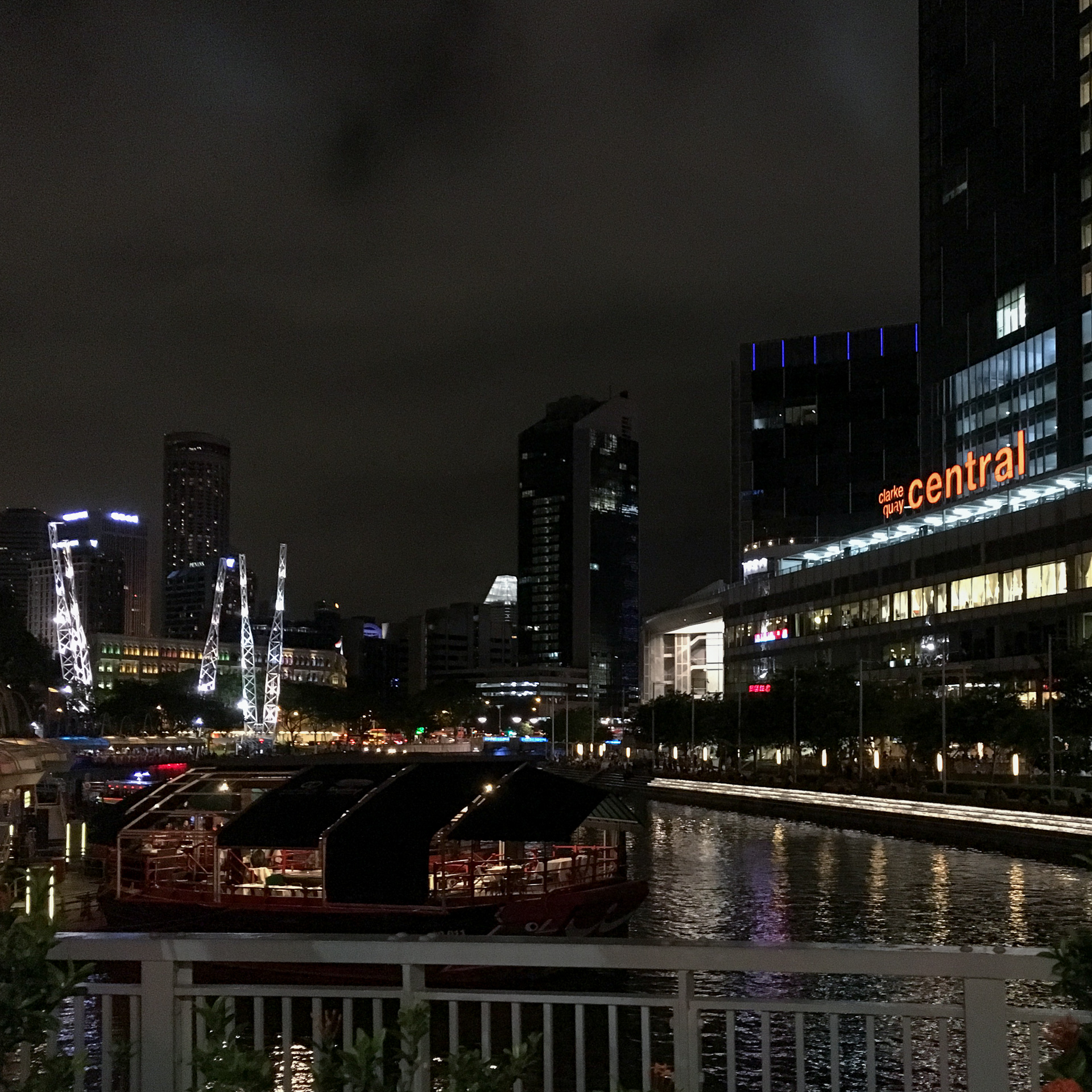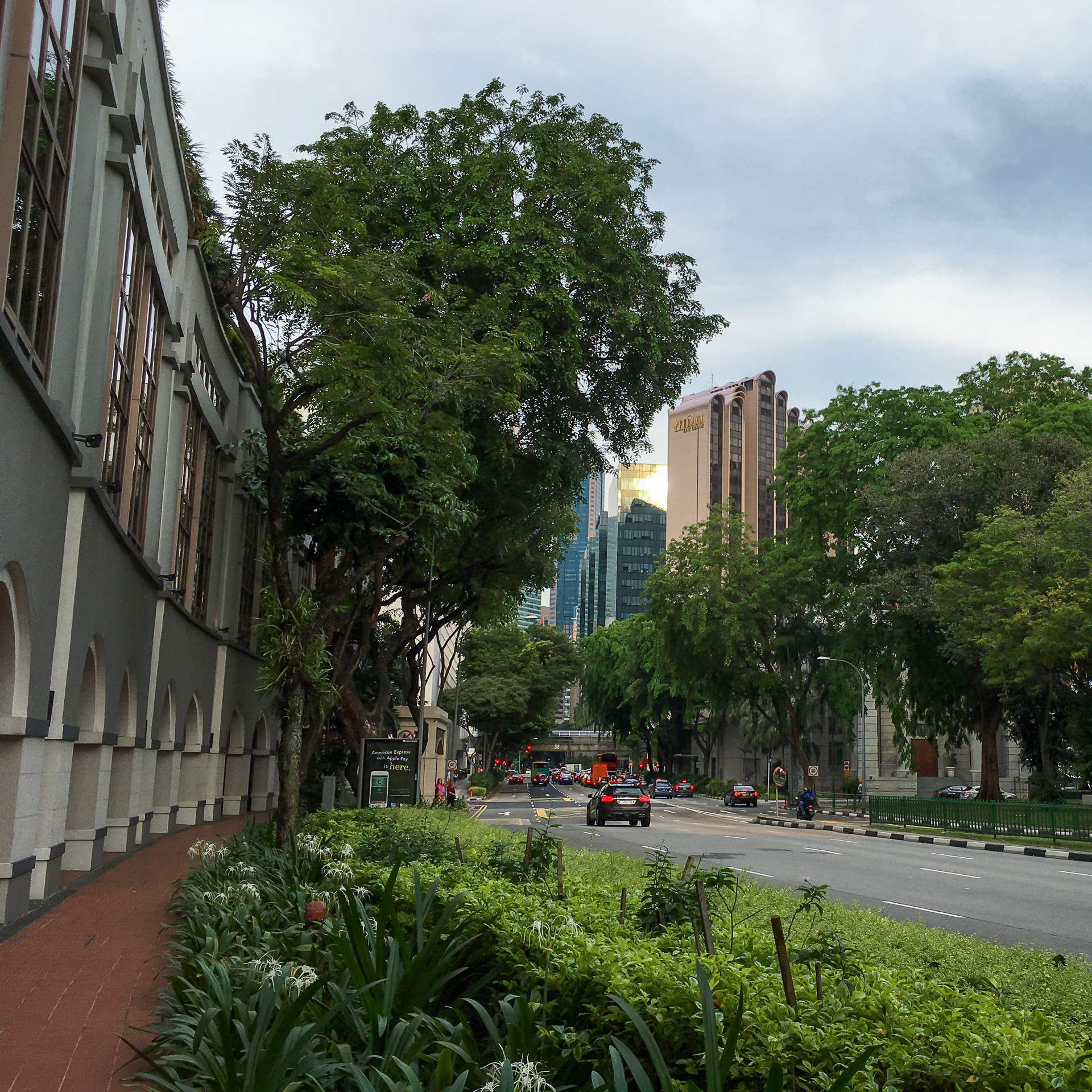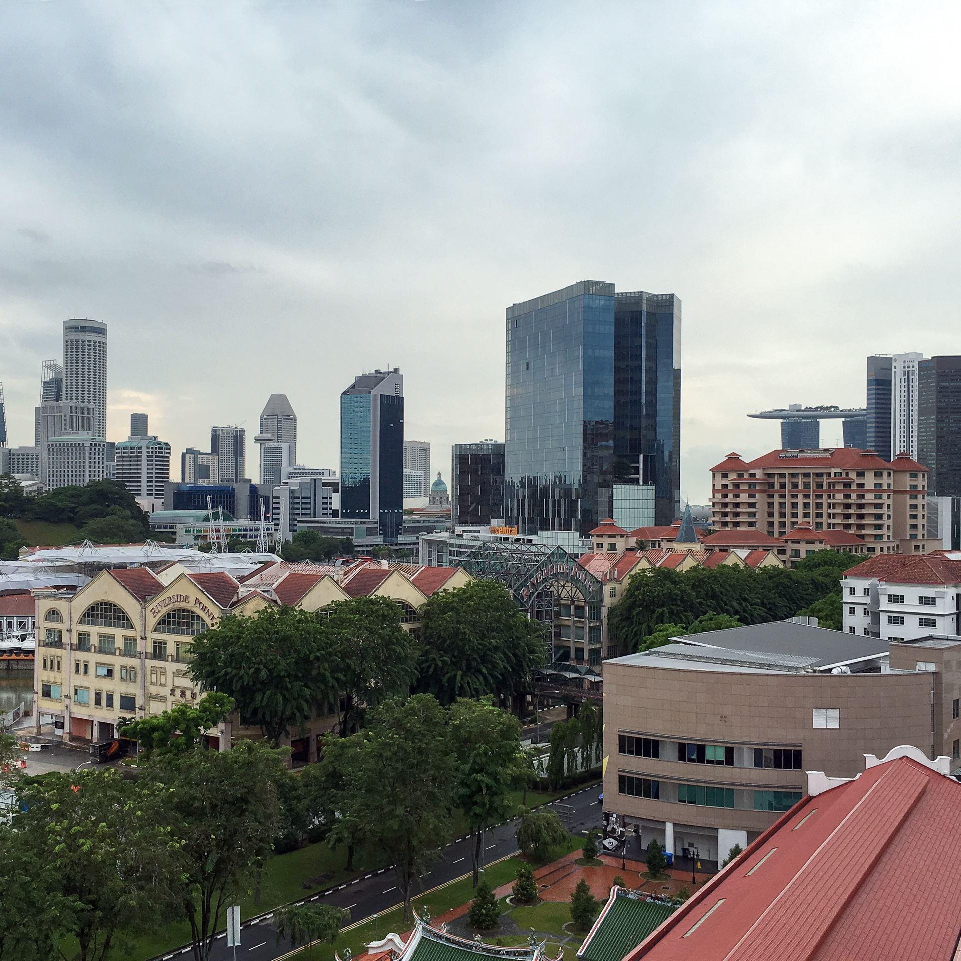 Blick vom Dach des Holday Inn Richtung Marina BayDer Swimming Pool auf dem Dach des Holiday Inn ExpressDie Treppe am Übergang über die Merchant RoadNahe am Äquator ist es auch in der Großstadt überall grün: Havelock RoadWohnhaus an der Upper Cross StVor dem Peoples Park Complex in Chinatown: Kreuzung Eu Tong Sen Street mit Upper Cross StreetAbendessen beim Inder am Clarke QuayClarke Quay bei Nacht