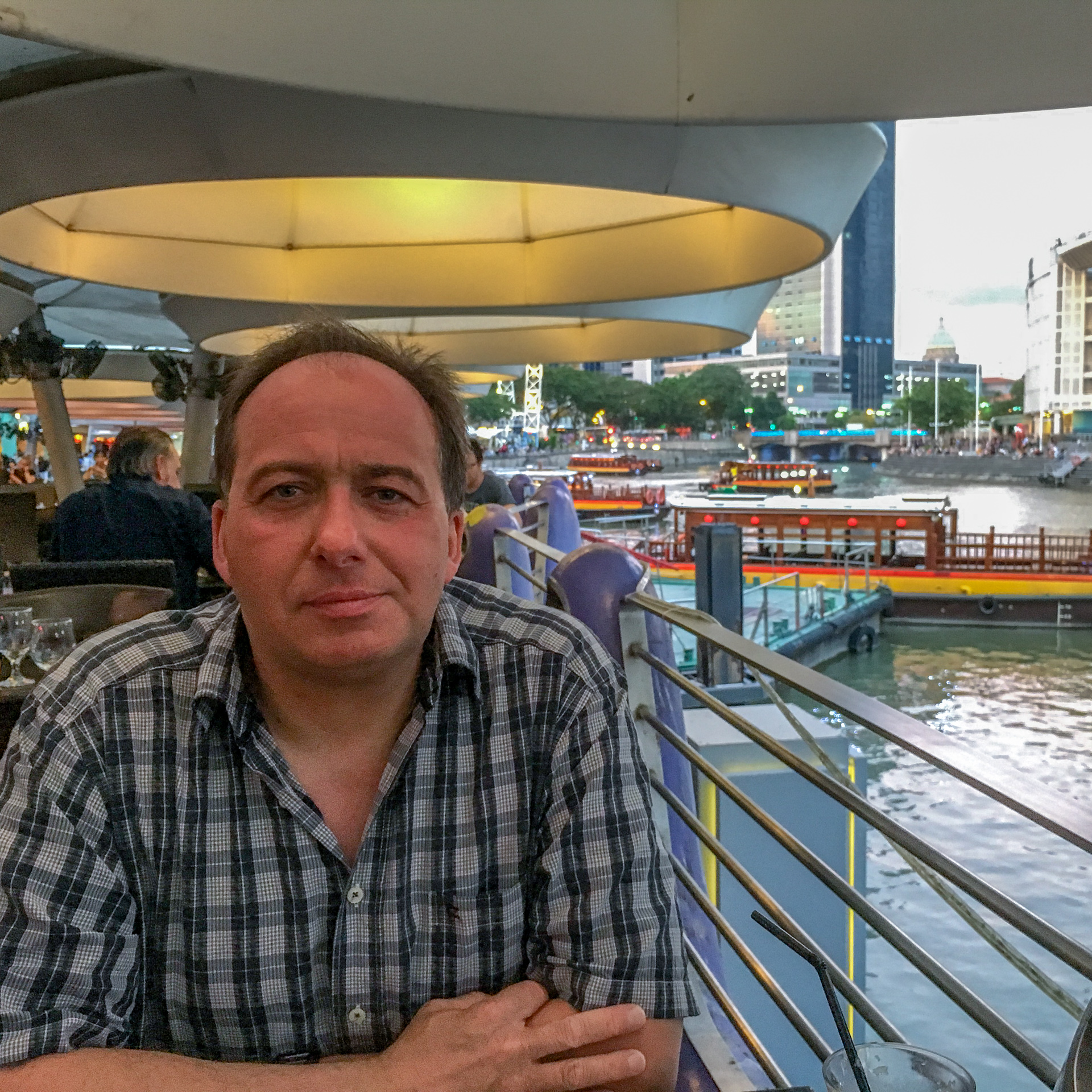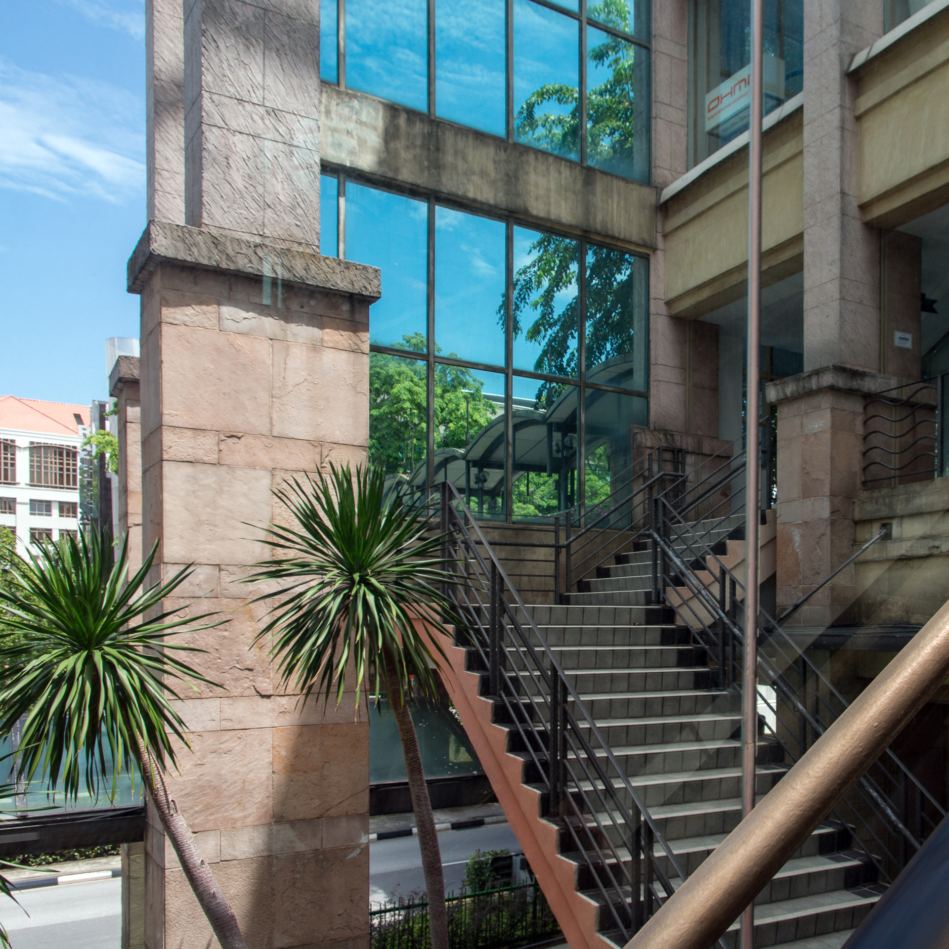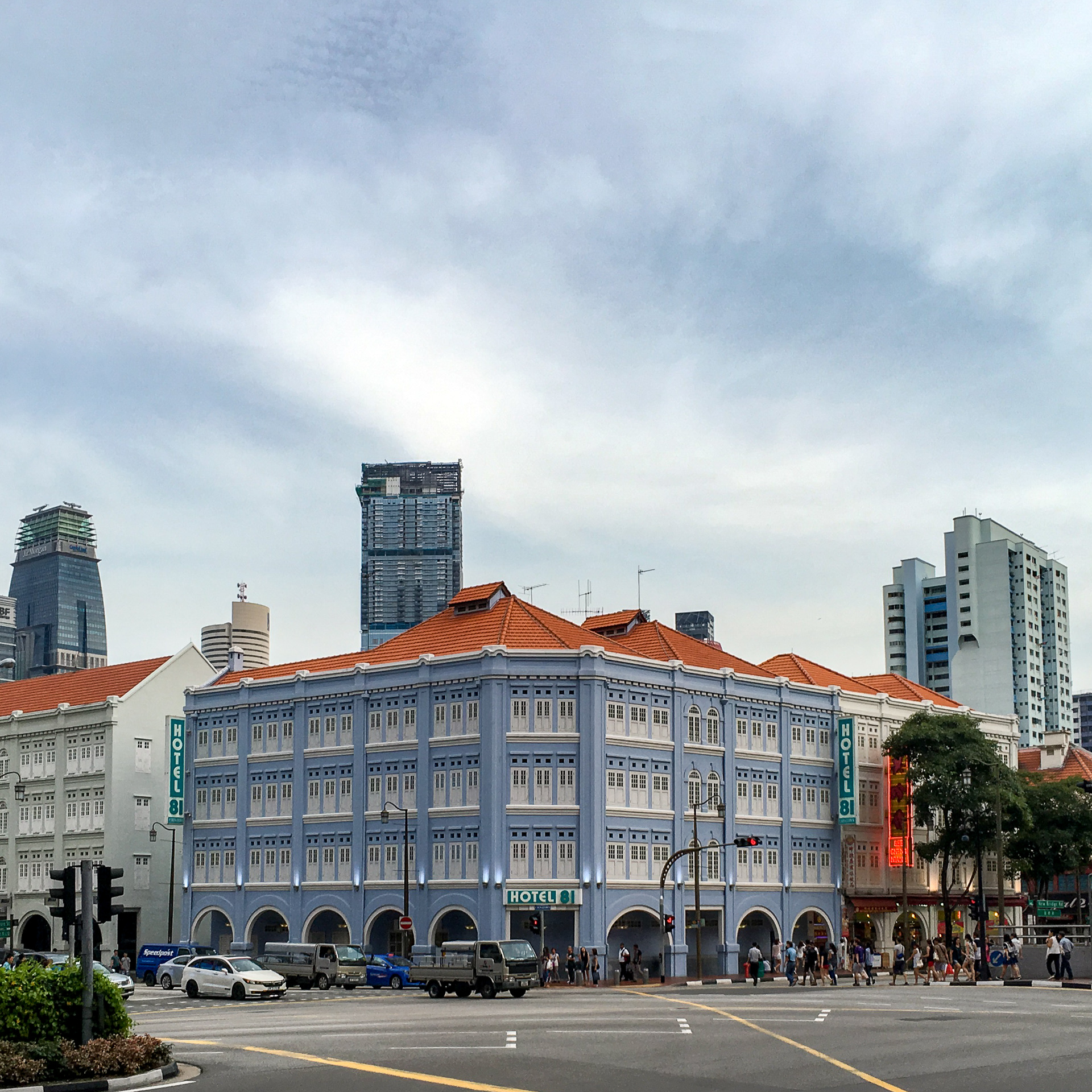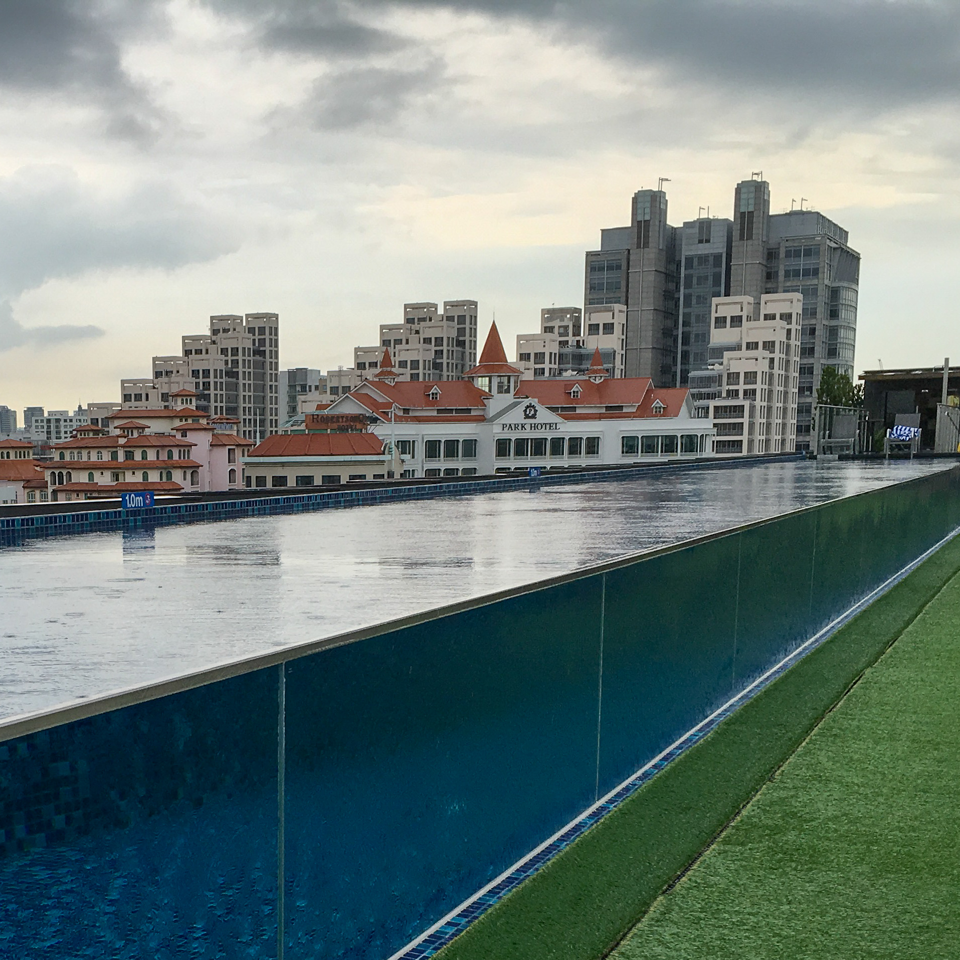 Blick vom Dach des Holday Inn Richtung Marina BayDer Swimming Pool auf dem Dach des Holiday Inn ExpressDie Treppe am Übergang über die Merchant RoadNahe am Äquator ist es auch in der Großstadt überall grün: Havelock RoadWohnhaus an der Upper Cross StVor dem Peoples Park Complex in Chinatown: Kreuzung Eu Tong Sen Street mit Upper Cross StreetAbendessen beim Inder am Clarke QuayClarke Quay bei Nacht