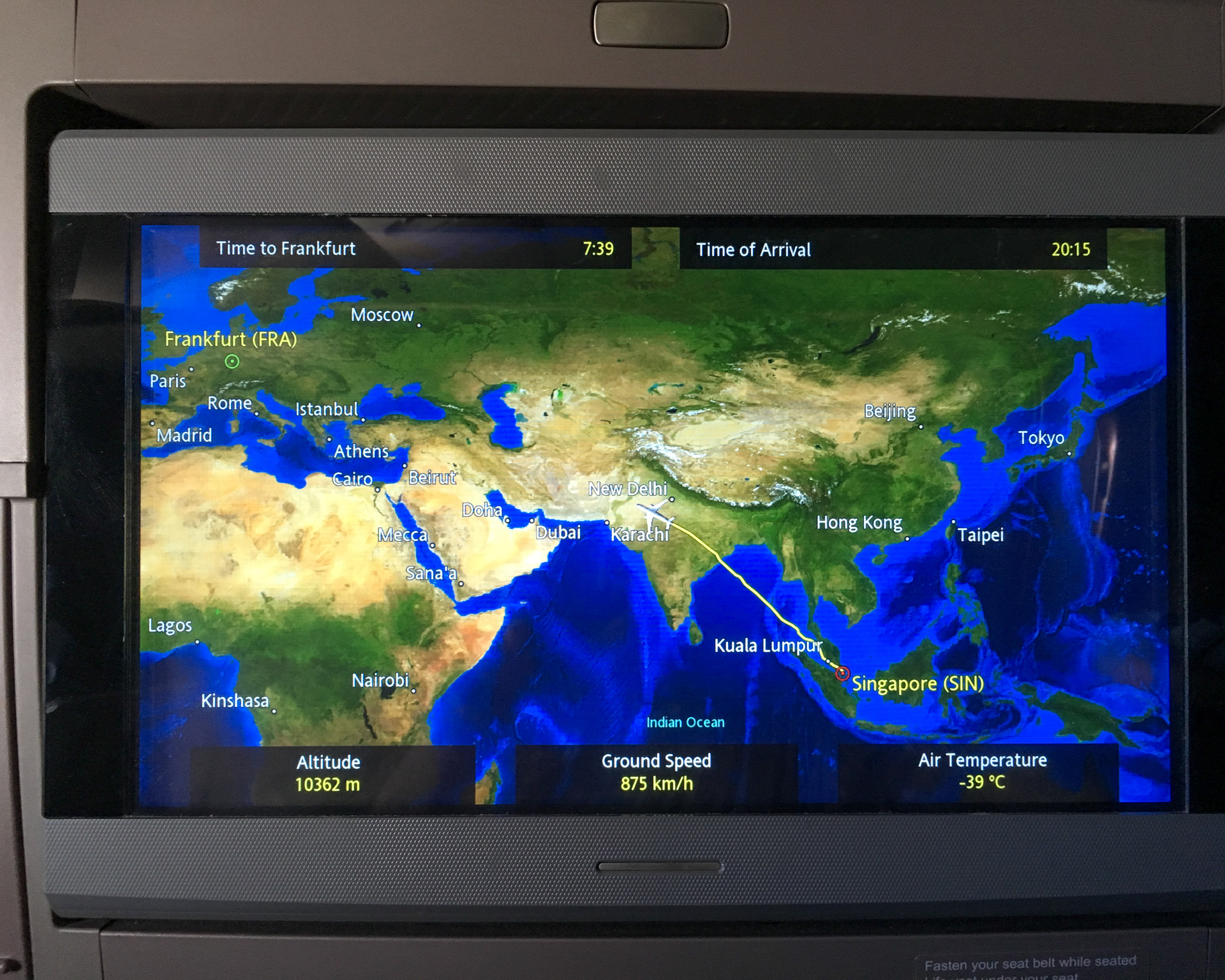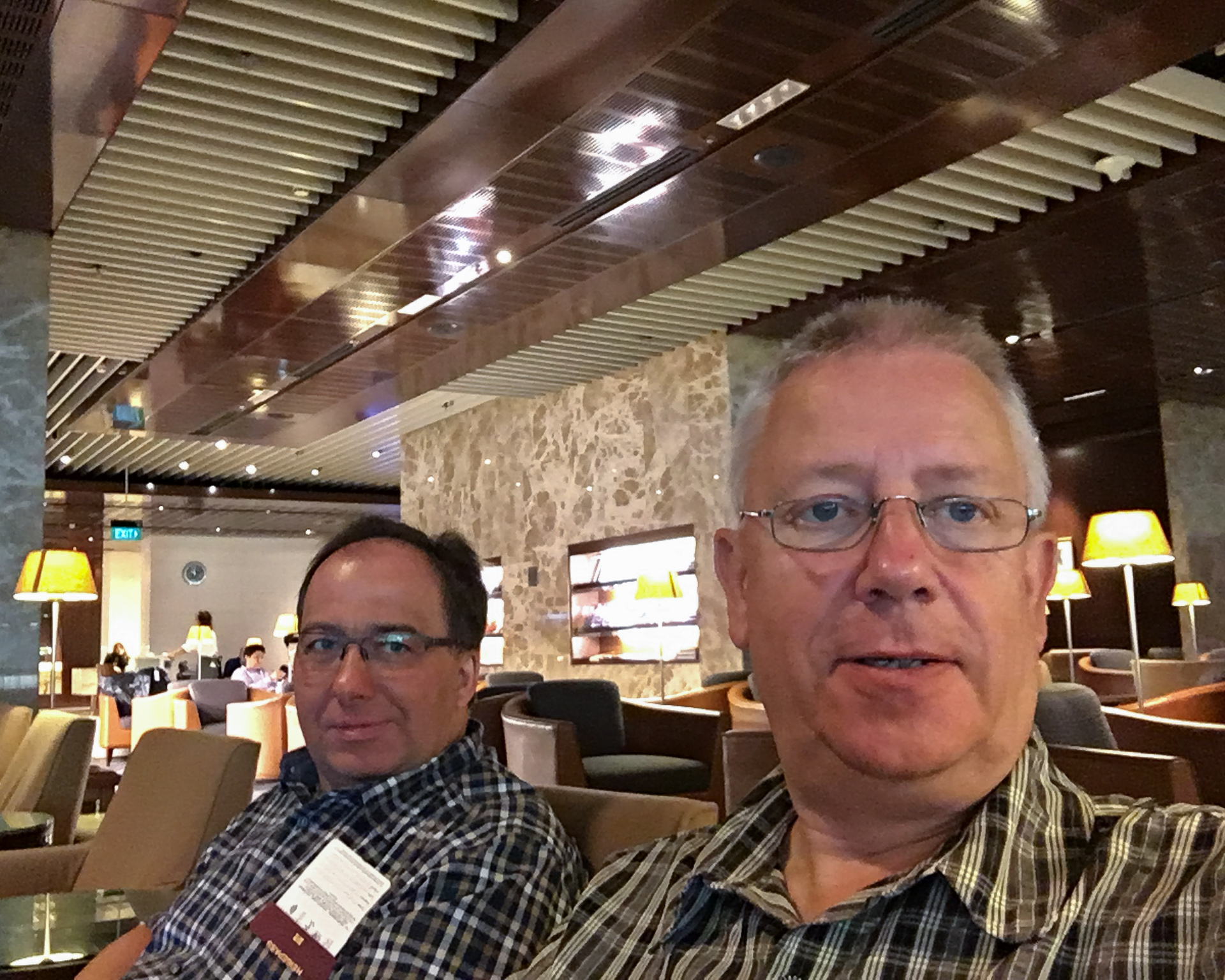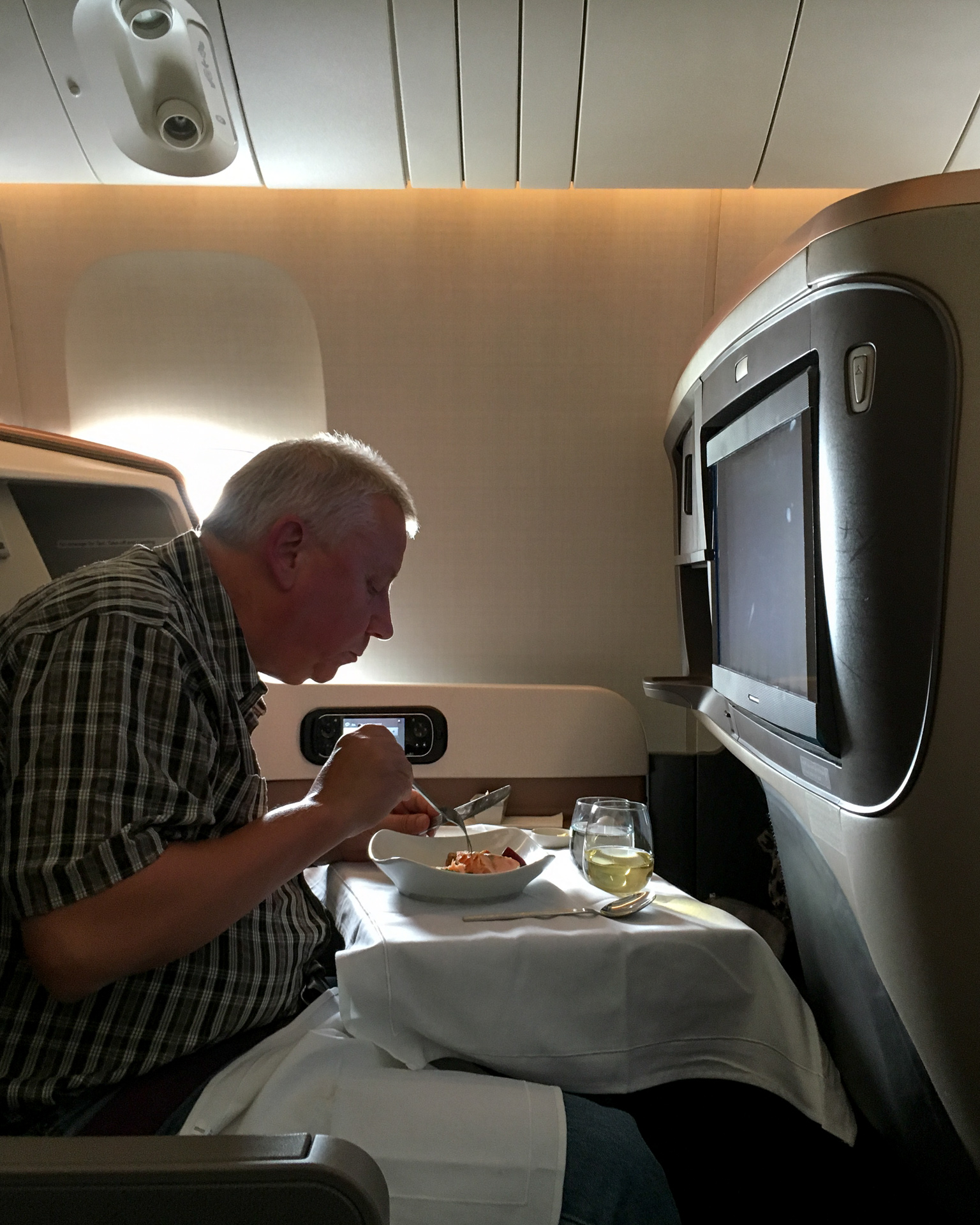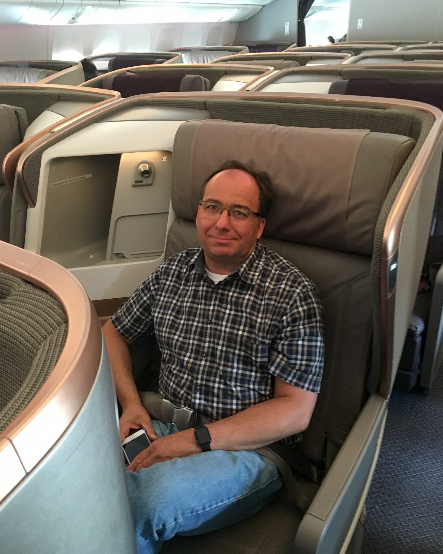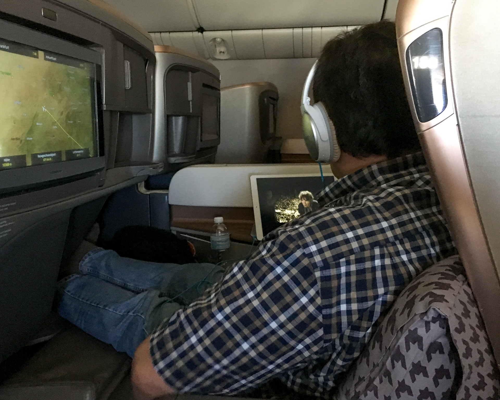 Die Singapore Airlines Business Class LoungeStephan und ich in der LoungeSieht ja ziemlich groß aus, aber zum längeren Sitzen unpraktisch: Singapore Airlines Business ClassIch bekam doch noch eine Gabel und konnte mein Essen geniessenOhne Kissen im Rücken konnte man es sich auf den Sitzen nicht bequem machen. Stephan schaut lieber einen mitgebrachten Film.Noch 2/3 des Fluges liegen vor uns