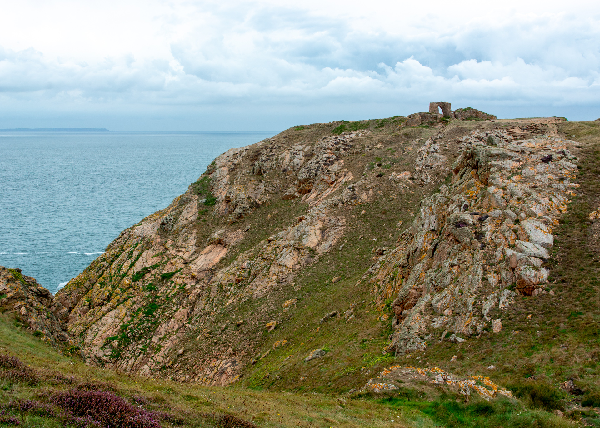 Während sich Tanja tatsächlich eine Auster leistet, begnügen Stephan und ich uns mit Fischbrötchen. Danach gibt es leichte Uneinigkeit über das weitere Programm, die Rückfahrt mit dem Bus erscheint sehr verlockend. Ich setze mich aber durch und es geht weiter auf dem ‚Cliff Path‘ zum Grosnez Castle. Praktisch die gesamte Nordküste kann man auf schmalen Pfaden direkt über dem Meer entlangwandern. Der Anfang ist das schwierigste, müssen wir doch den Aufstieg aufs Kliff bewältigen.