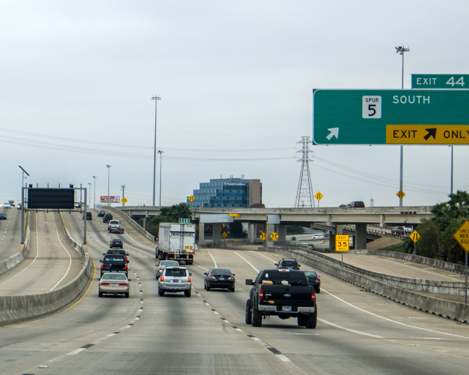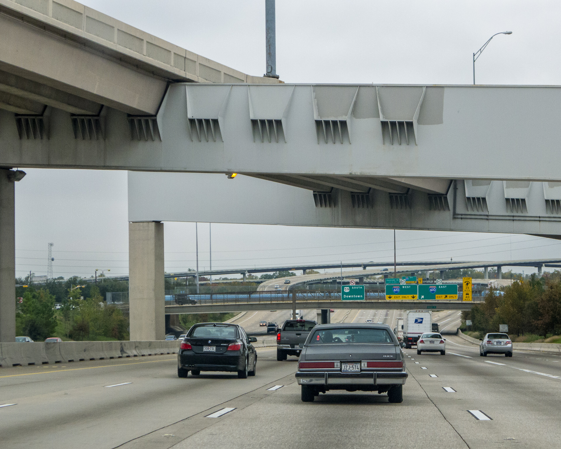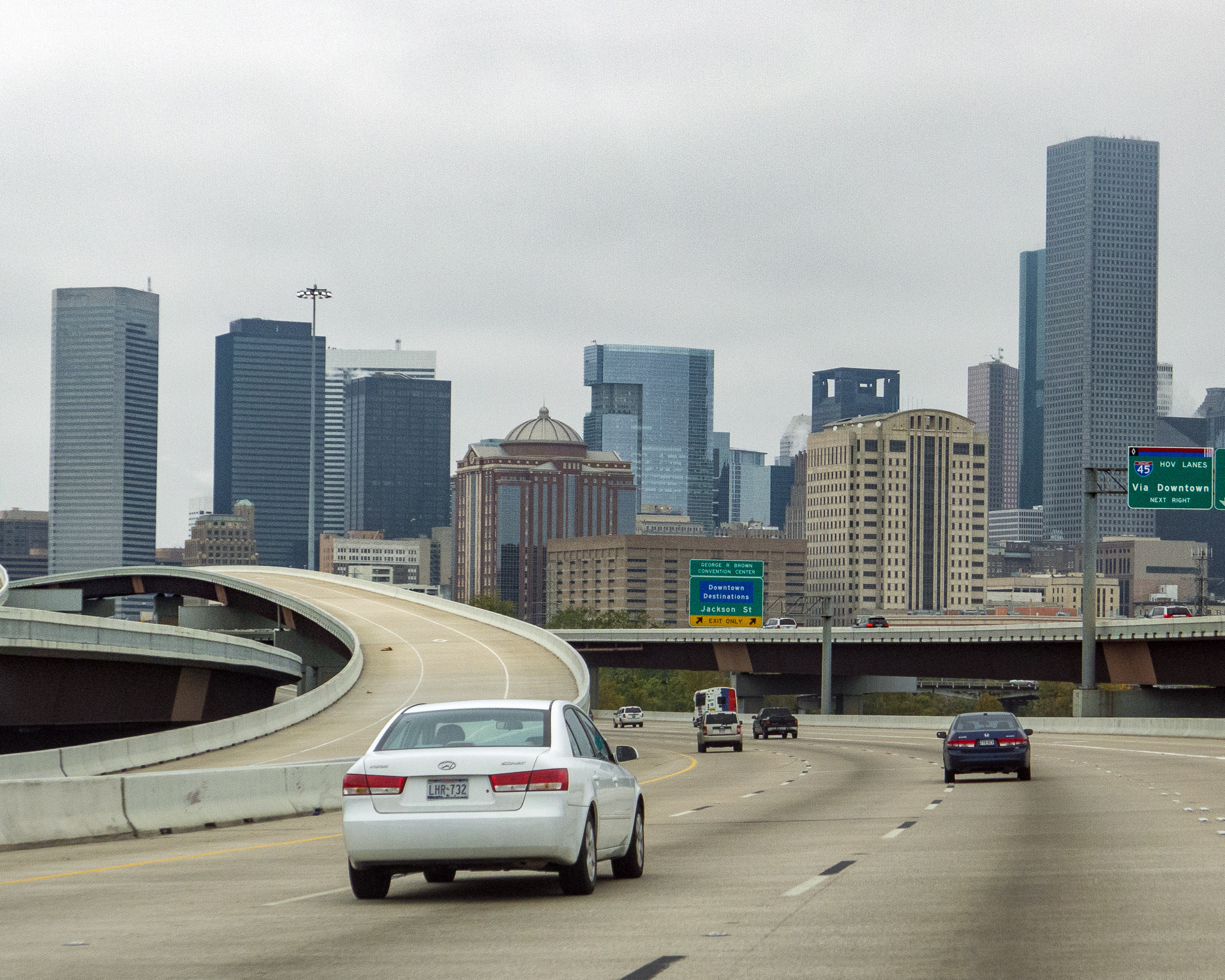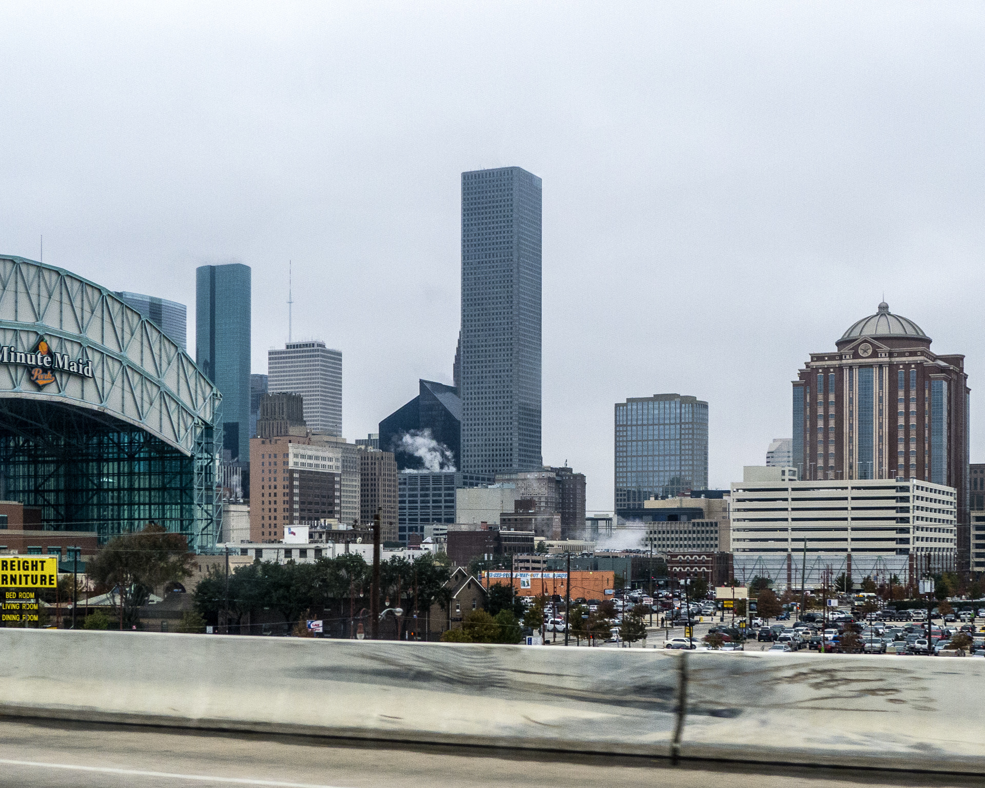Wir fahren die gleiche Autobahn wie gestern Richtung Downtown und heute halte ich die Kamera bereit, aber das Wetter ist diesig und von der Skyline Houstons nicht viel zu sehen.