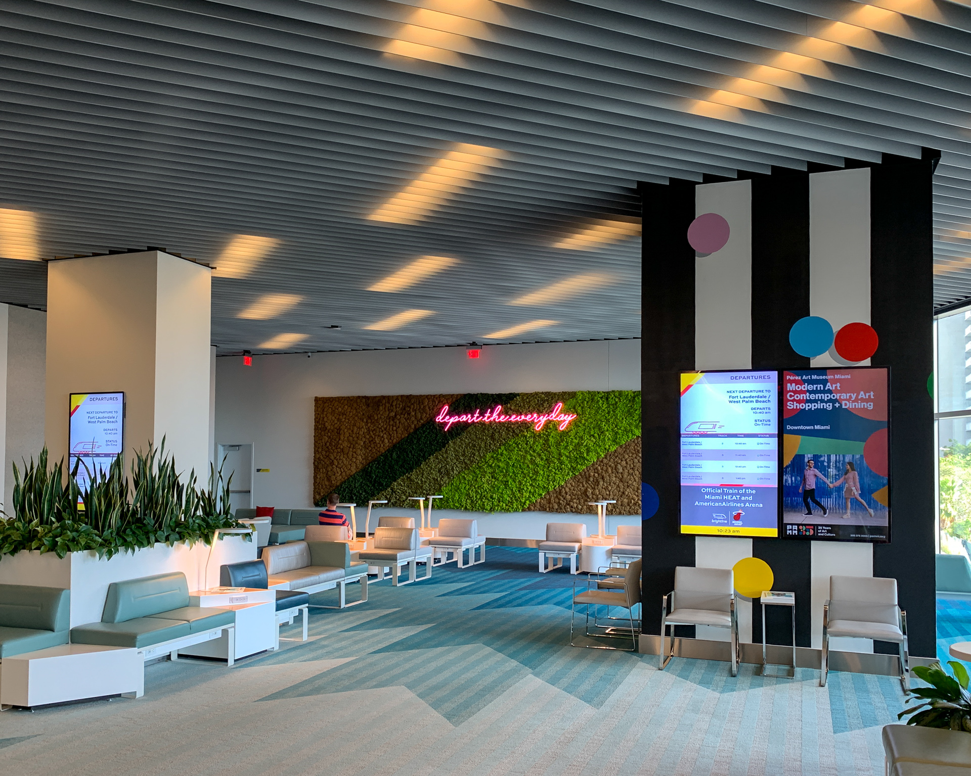 Innen ist alles modern, cool und schick, Billigreisende sind nicht die Zielgruppe von Brightline. Wir haben uns für den totalen Luxus entschieden und „First Class“ gebucht. Das kostet 35 Dollar pro Person und Strecke, und damit durchaus bezahlbar. Inbegriffen ist natürlich auch ein Loungezugang.