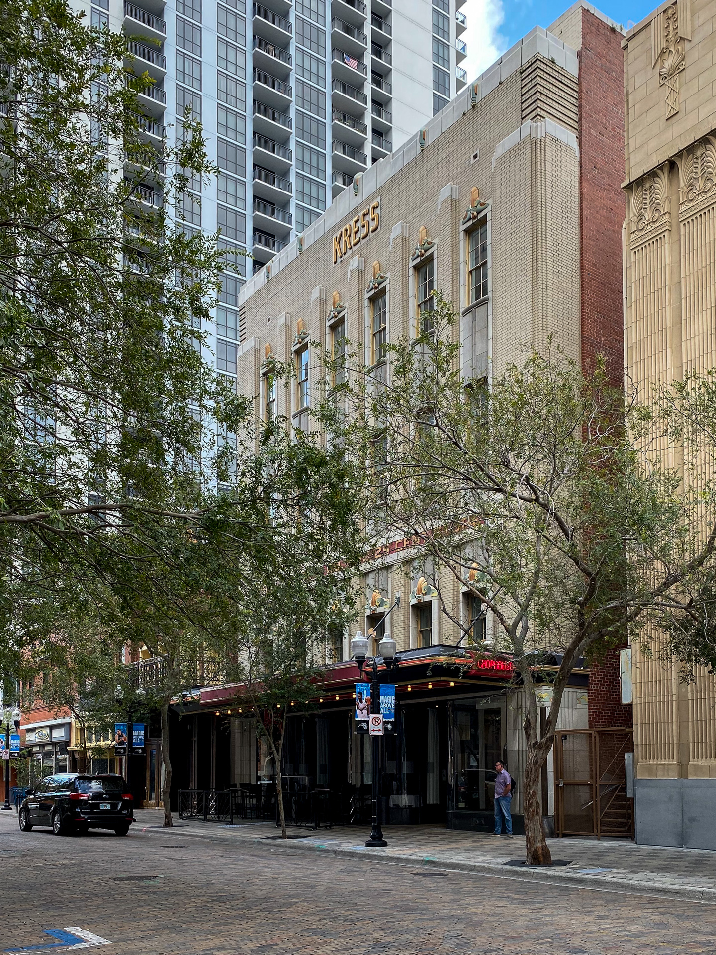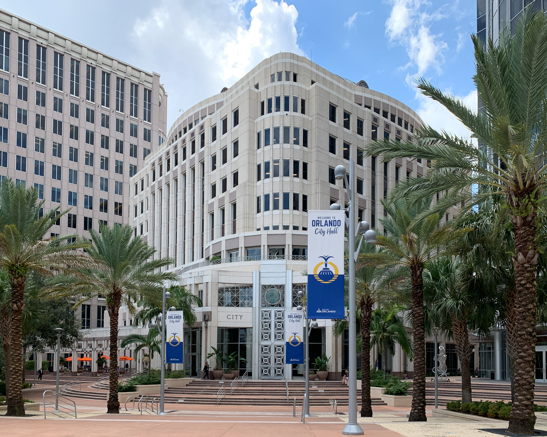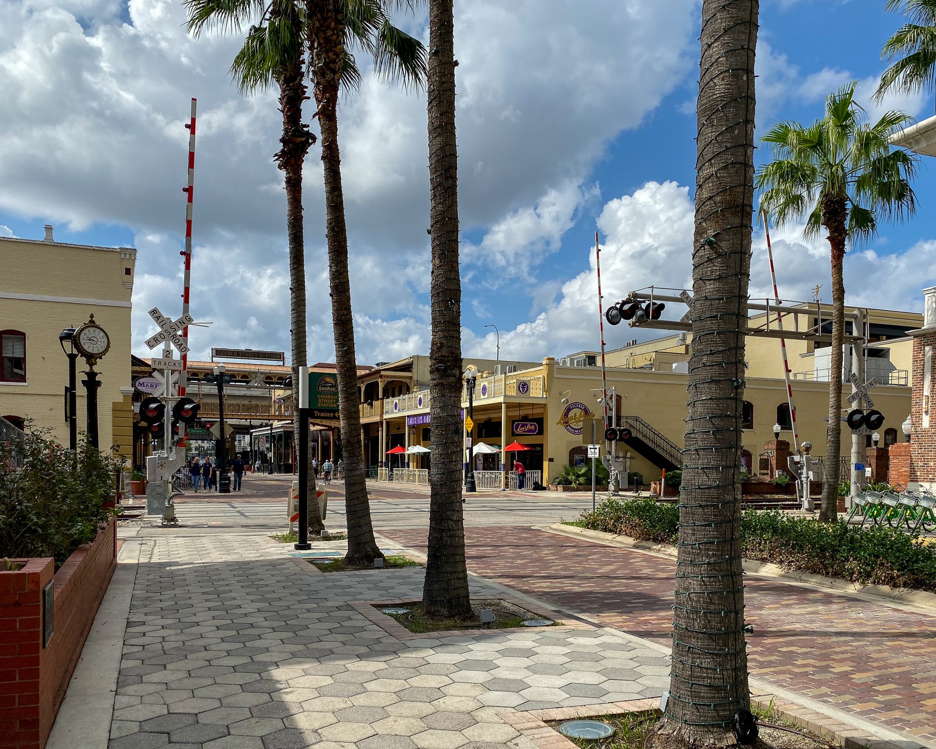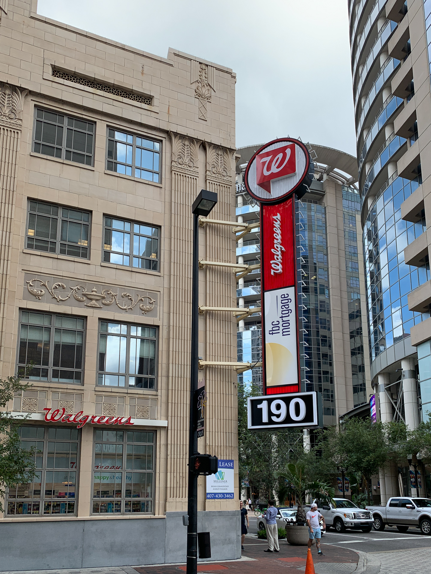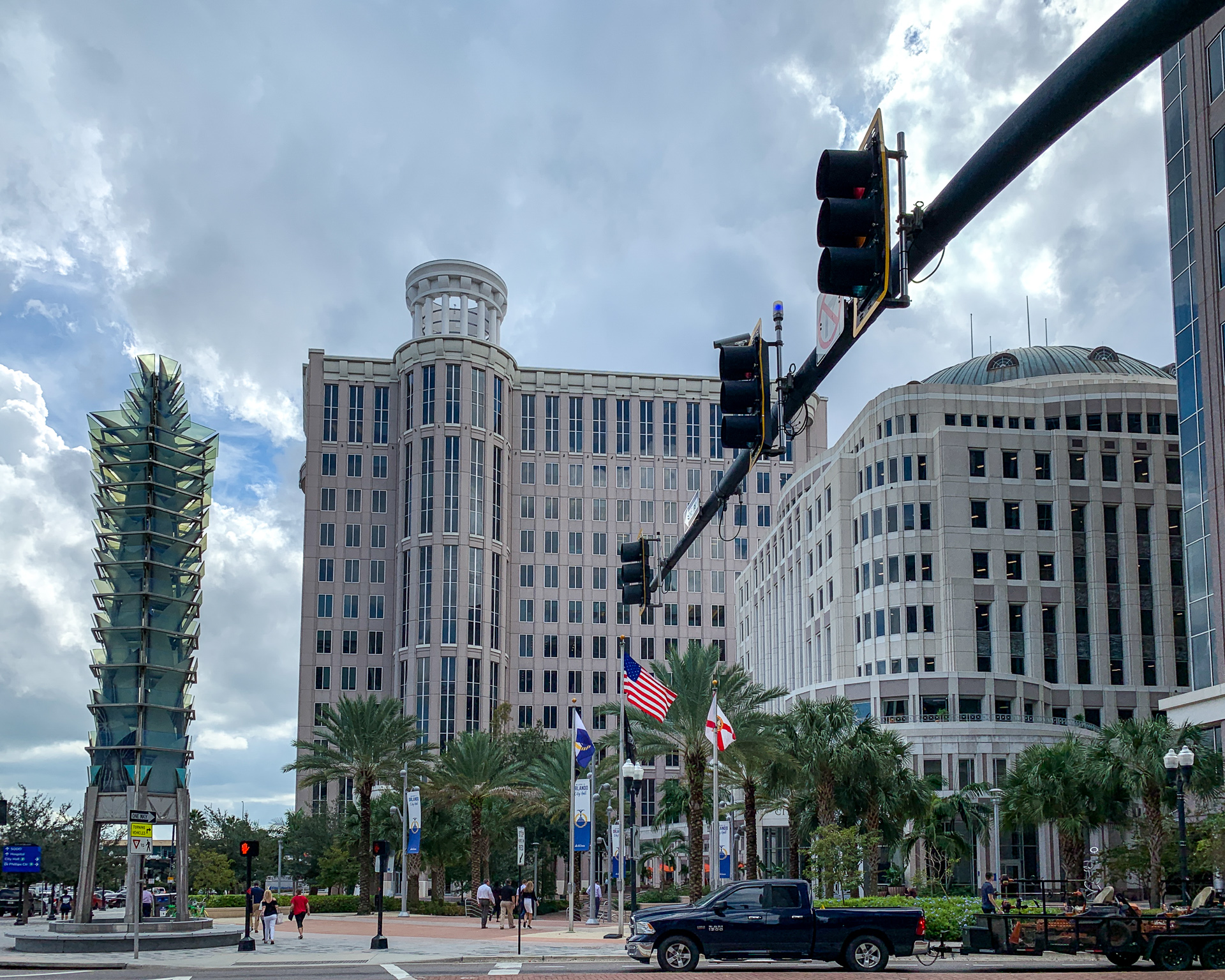 Zurück fahren wir über den Busbahnhof eine Station hinaus bis zur Church Street. Hier war in früheren Zeiten die hautpsächliche Bahnstation von Orlando, das originale Gebäude von 1889 steht noch. Der Bahnsteig Richtung Süden liegt allerdings jenseits der South Street, also gehen wir entlang dieser in die Innenstadt und landen als Erstes an der Kreuzung South Street/Orange Street.