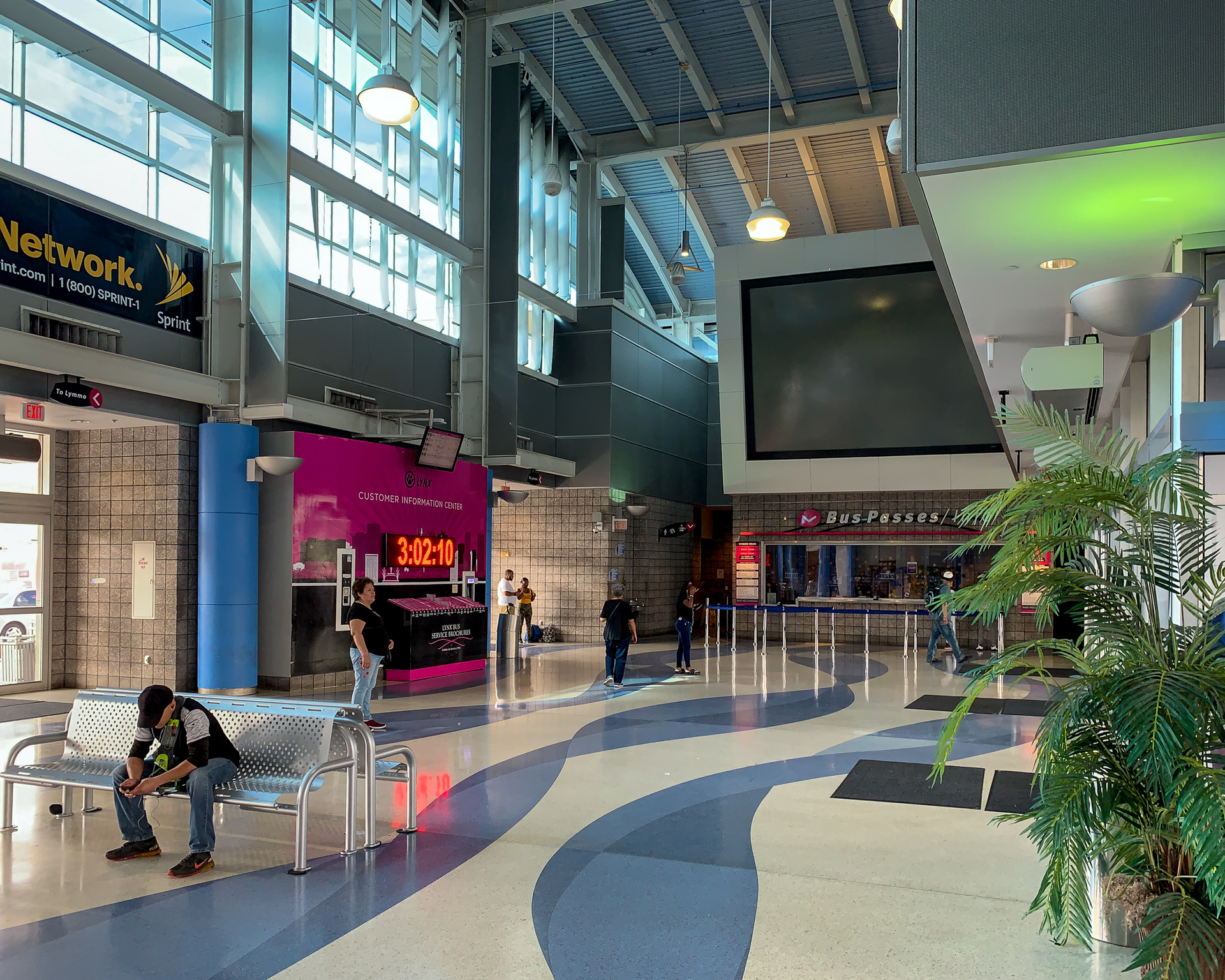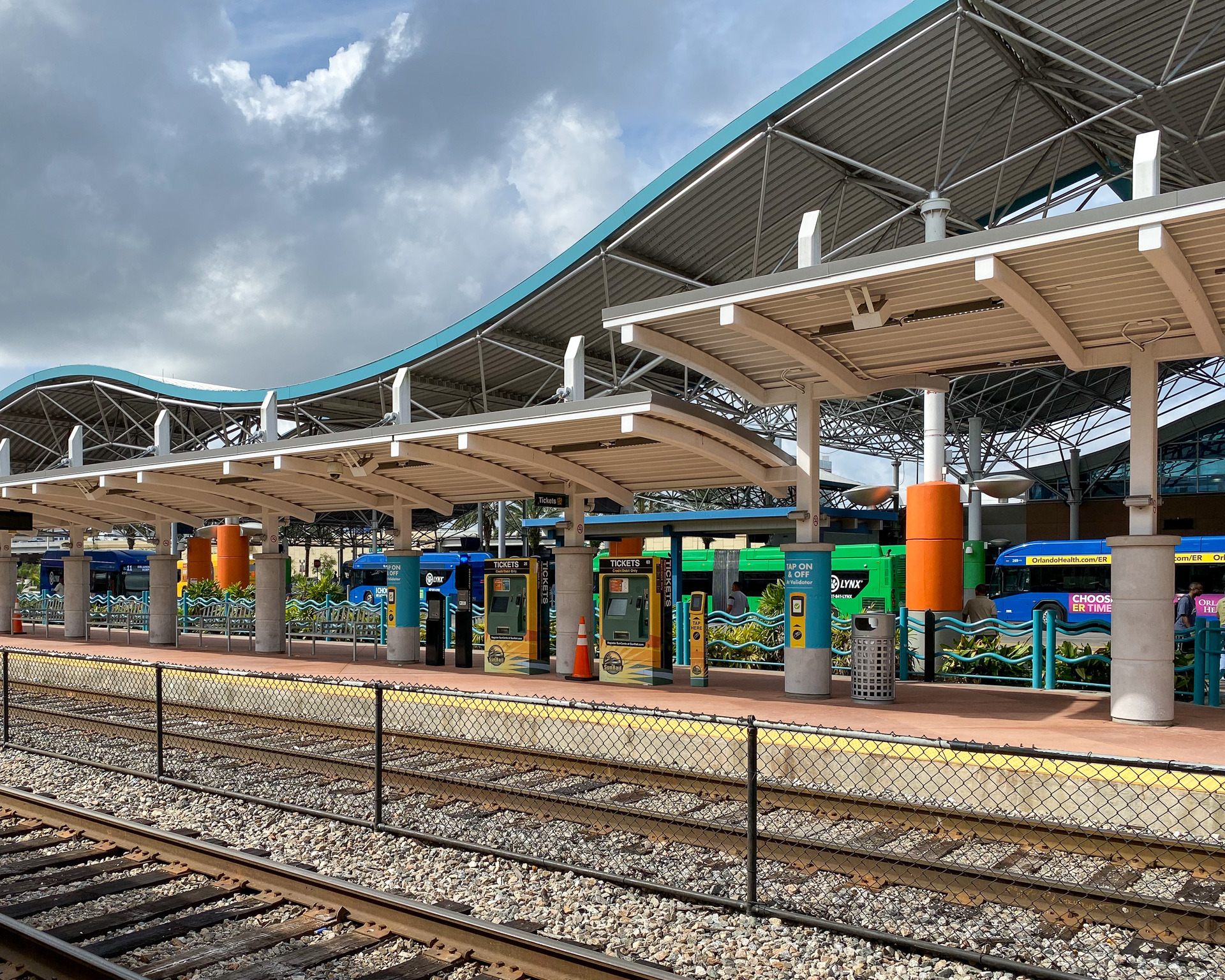 Der Bus fährt entlang des International Drive, also gibt es nach dem Frühstück einen kurzen Marsch dorthin und der nächste Bus der Linie 8 Richtung Downtown wird geboardet. Der Bus fährt zunächst entlang des International Drive und dann durch z.T. nicht sonderlich vornehme Vororte Orlandos, bis er nach knapp einer Stunde am Busbahnhof, LYNX Central genannt, ankommt. Der Busbahnhof nimmt einen ganzen Block zwischen Amelia und Livington Street direkt östlich der Interstate 4 ein.
